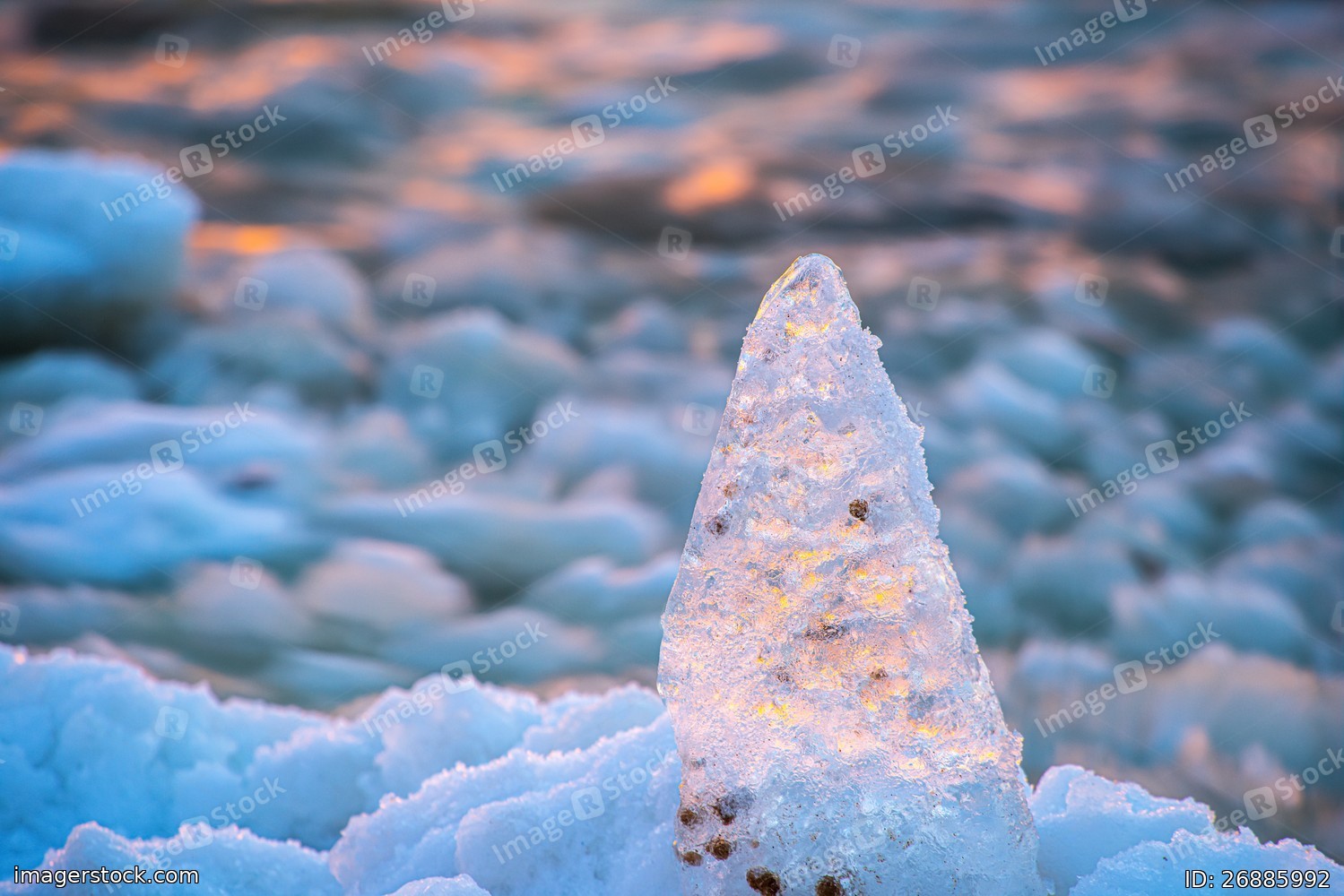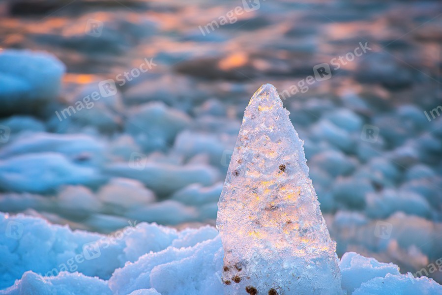 Close-up of piece of ice on snow on Baltic sea shore.