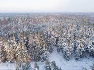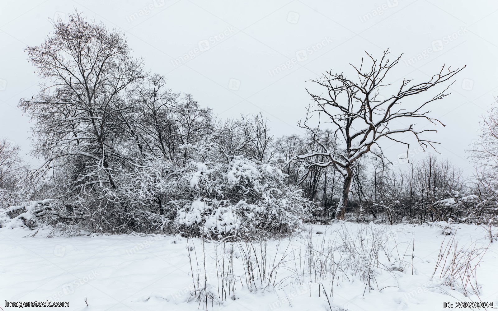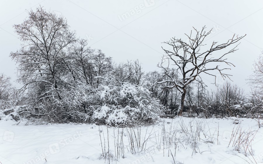 Scenic winter landscape. Beautiful nature. Snow-covered trees in the forest. Cloudy weather.