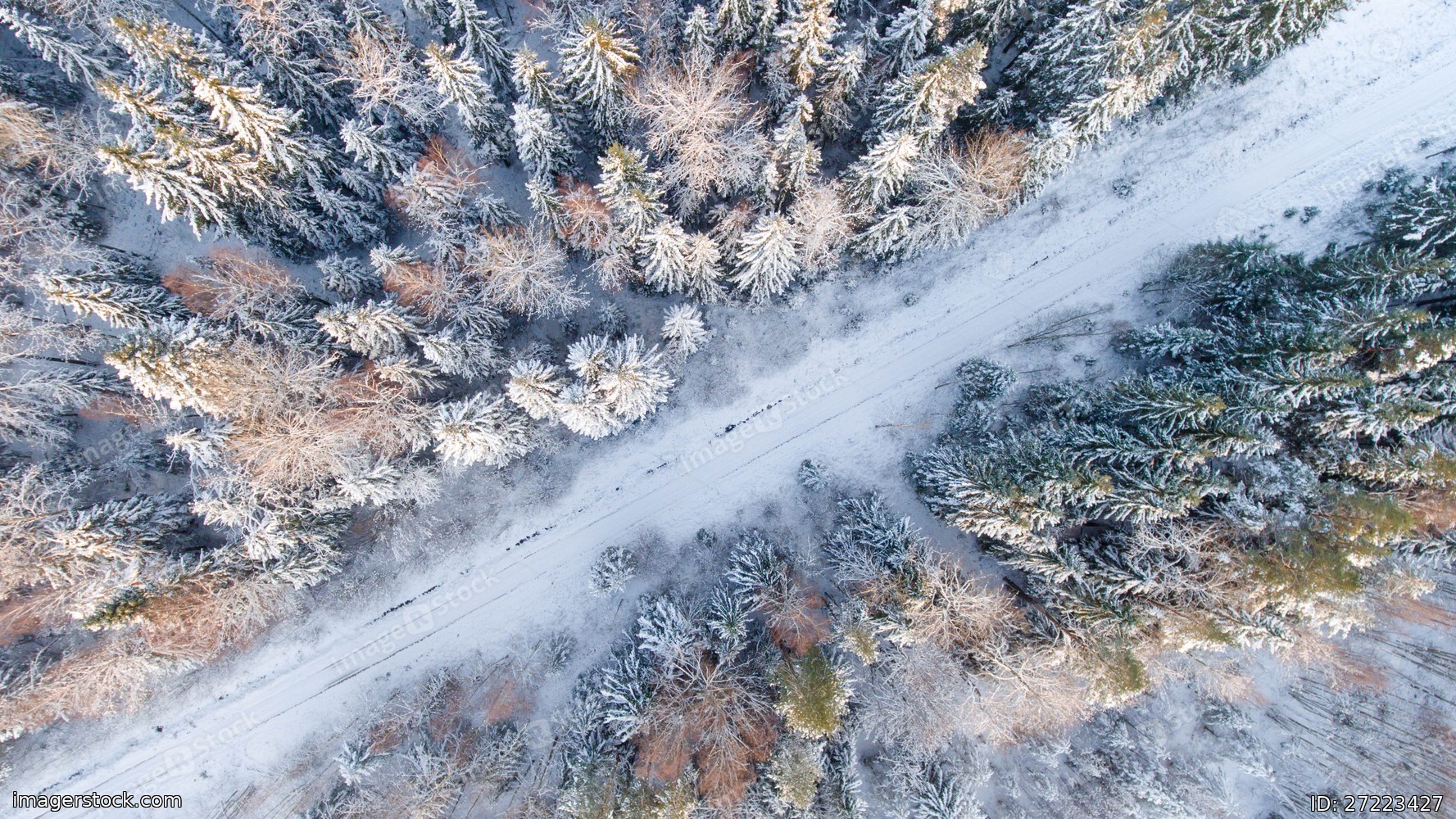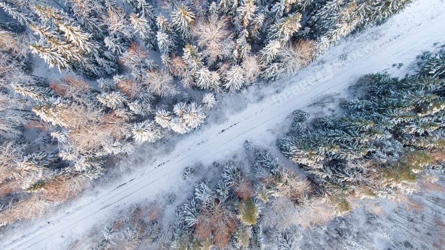 Top drone view of road in winter forest. Naked trees covered by snow. Scenic landscape.