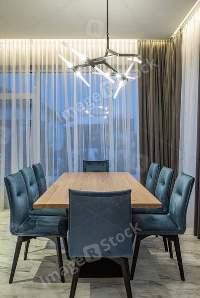 Huge wooden table and chairs. Interior of luxury kitchen in house.