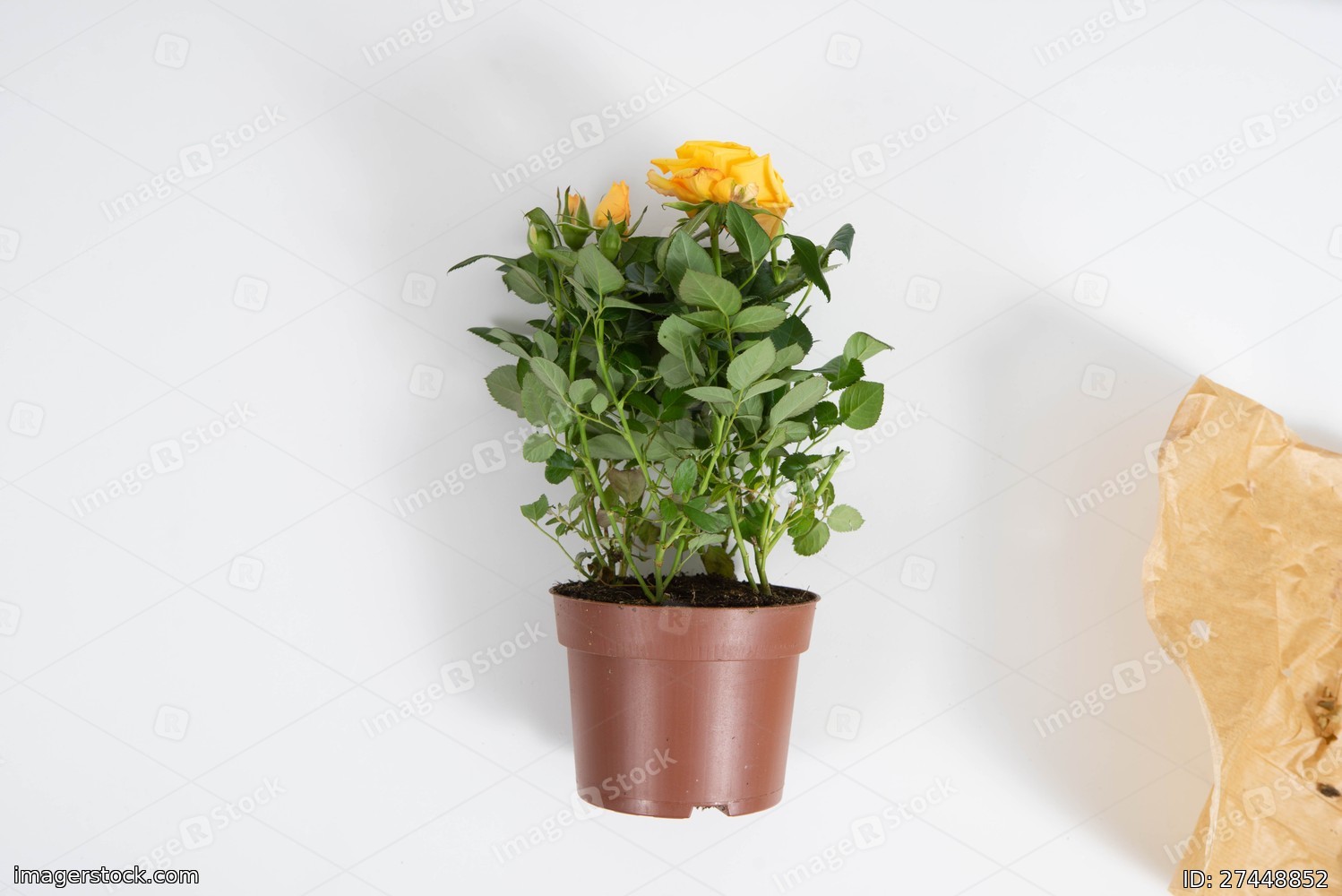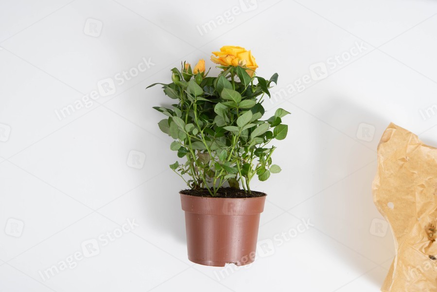 Close-up of yellow rose in the brown pot. View from above.