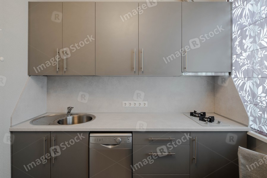Minimalistic modern interior of kitchen in shades of grey.