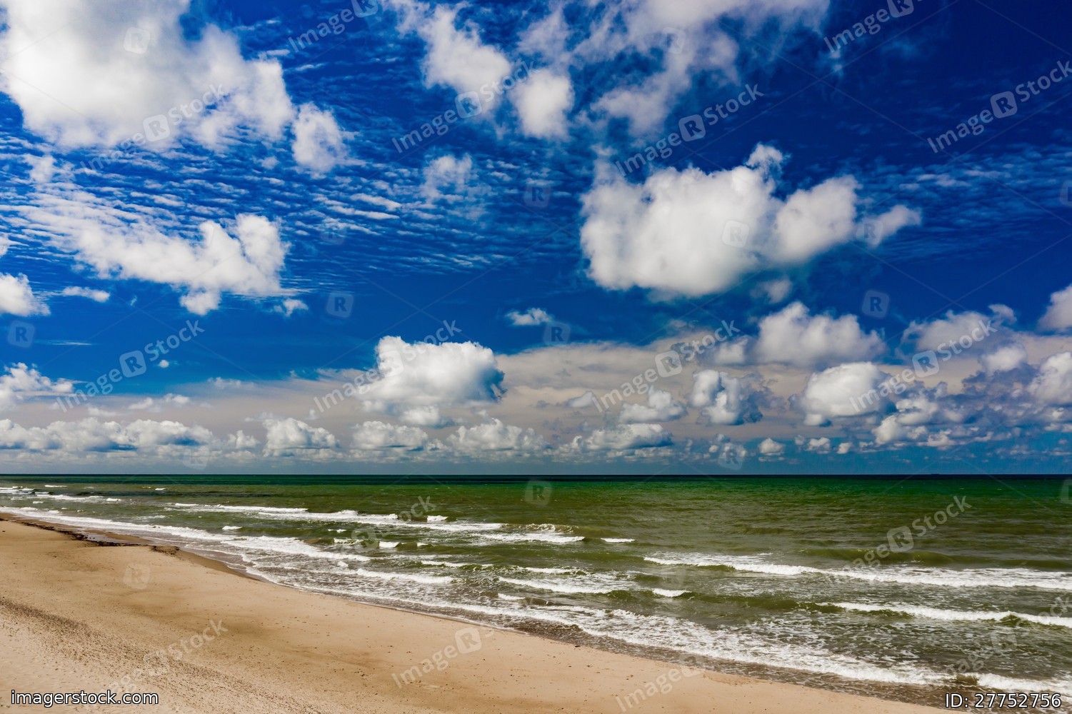 View of the sea. Empty seaside. Blue sky. Cloudy weather.