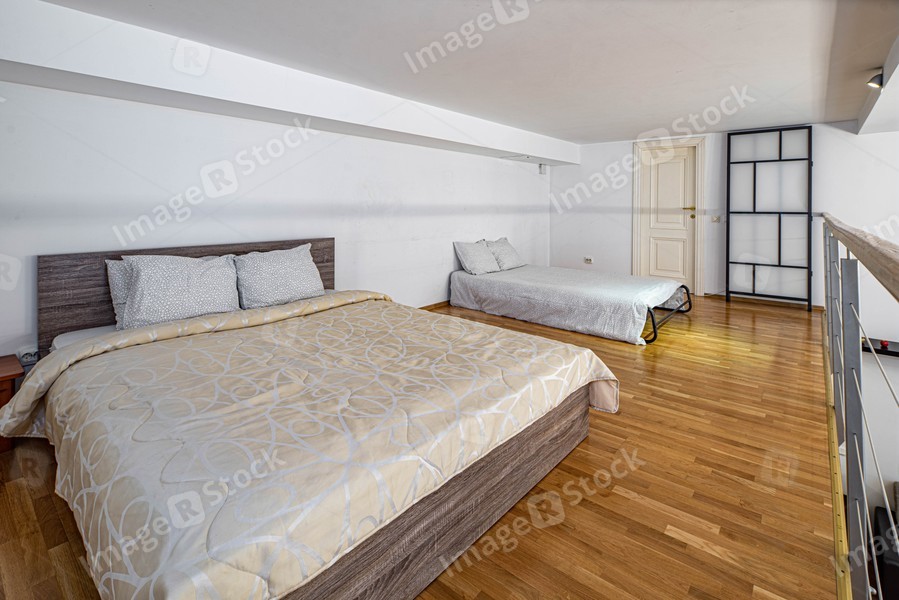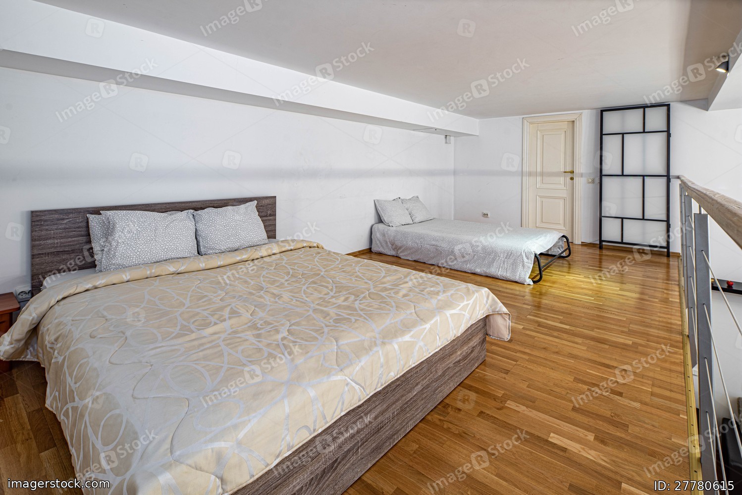Two cozy beds in spacious bedroom. Modern interior. Wooden floor.
