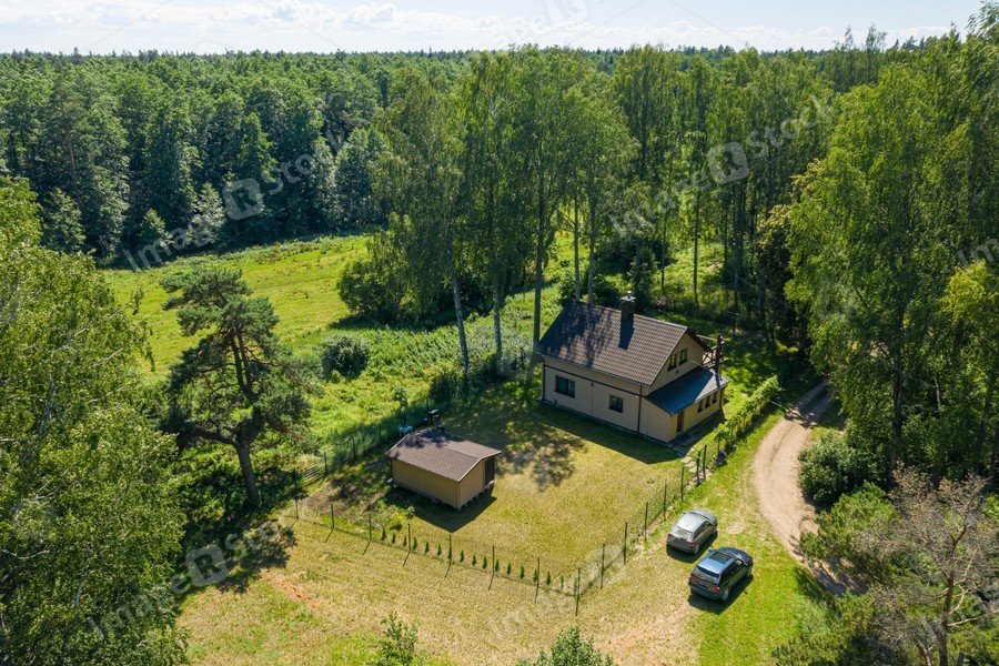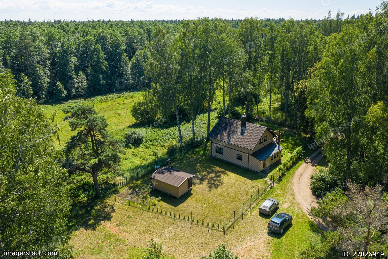 Top drone view of private country house and garage between green trees near the forest. Sunny summer day. Modern exterior.