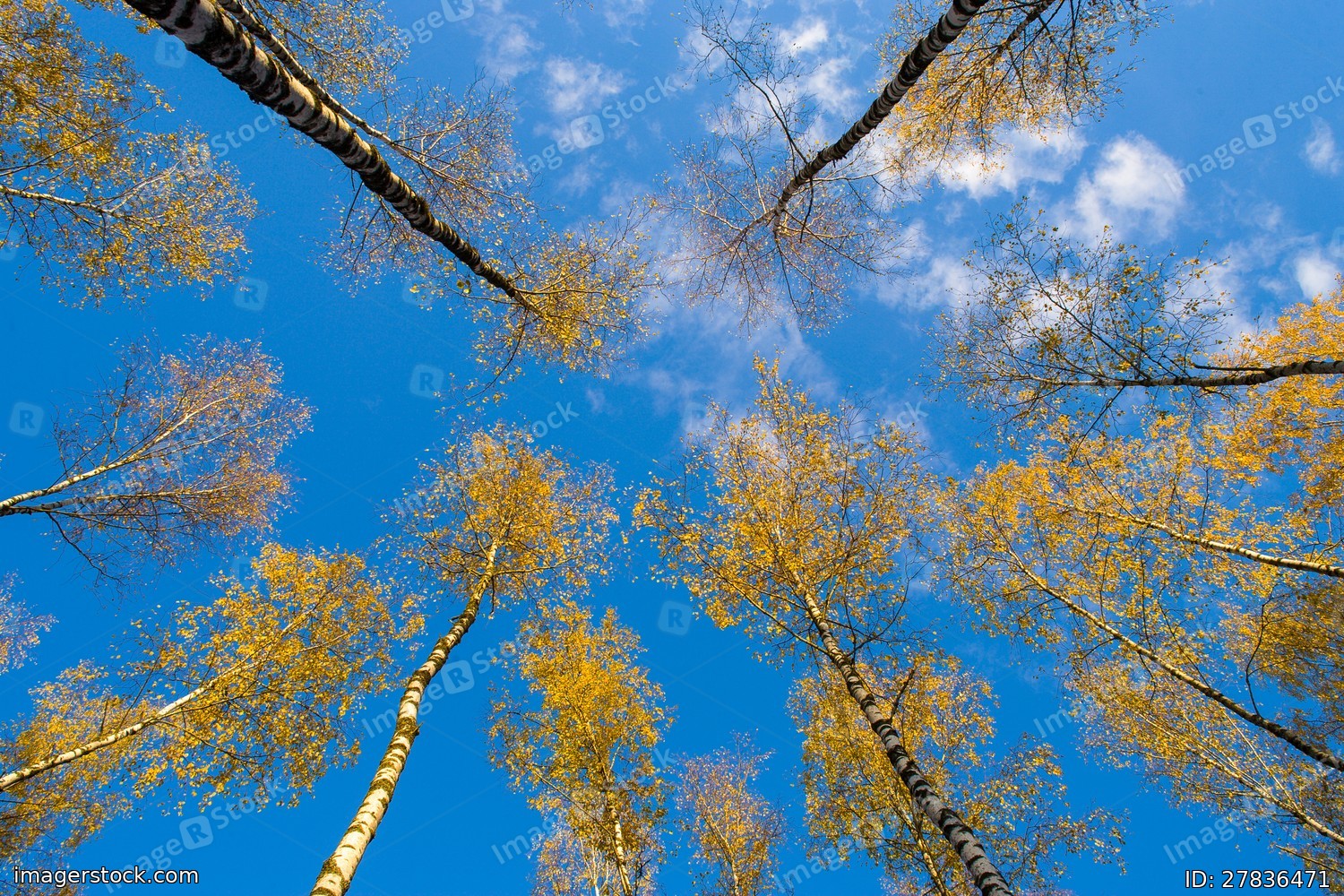 Birches view from below upwards, autumn, yellow leaves. Landscape.