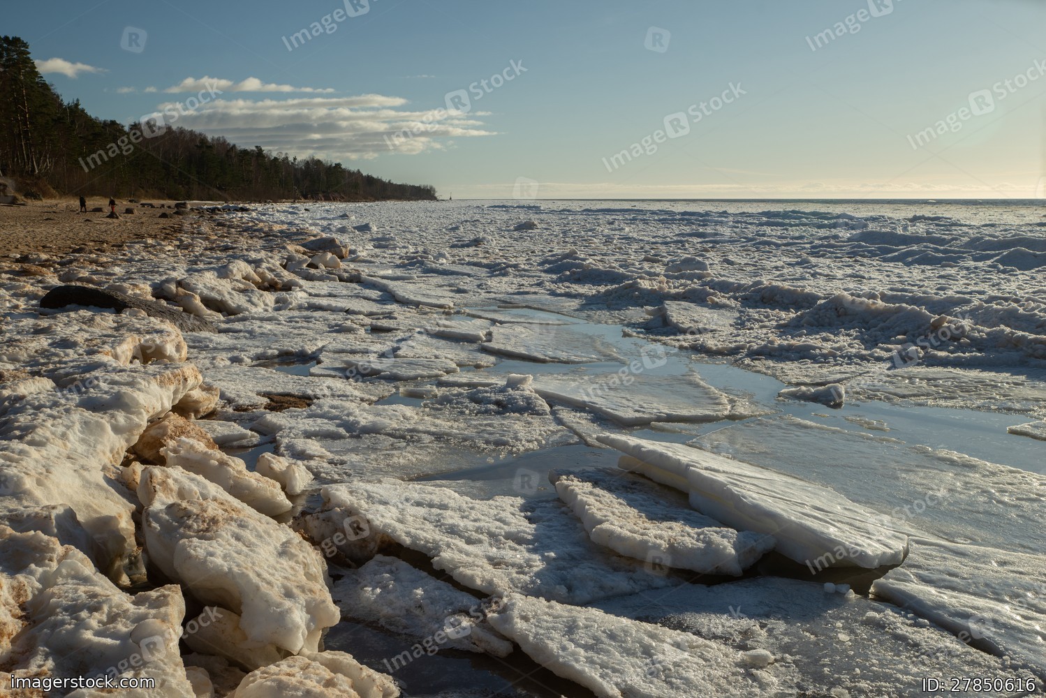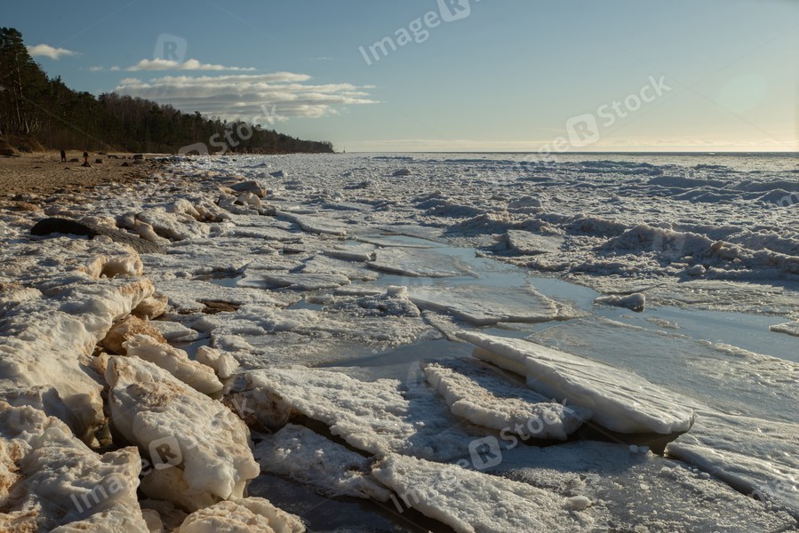Scenic landscape of shore of Baltic sea at winter. Snow on sand.