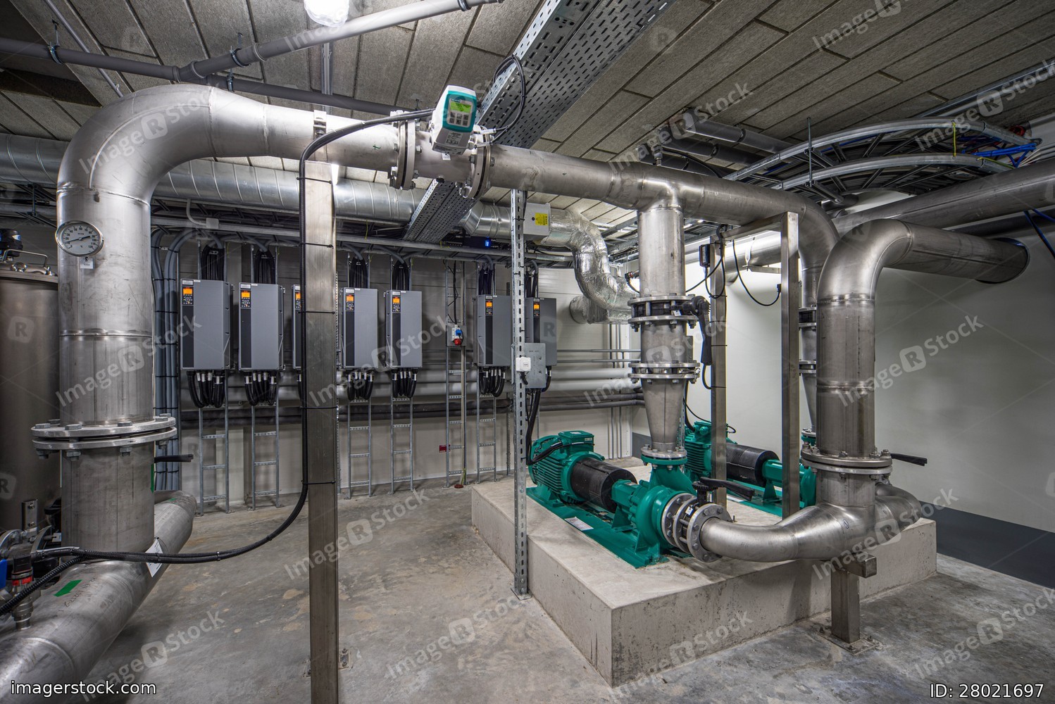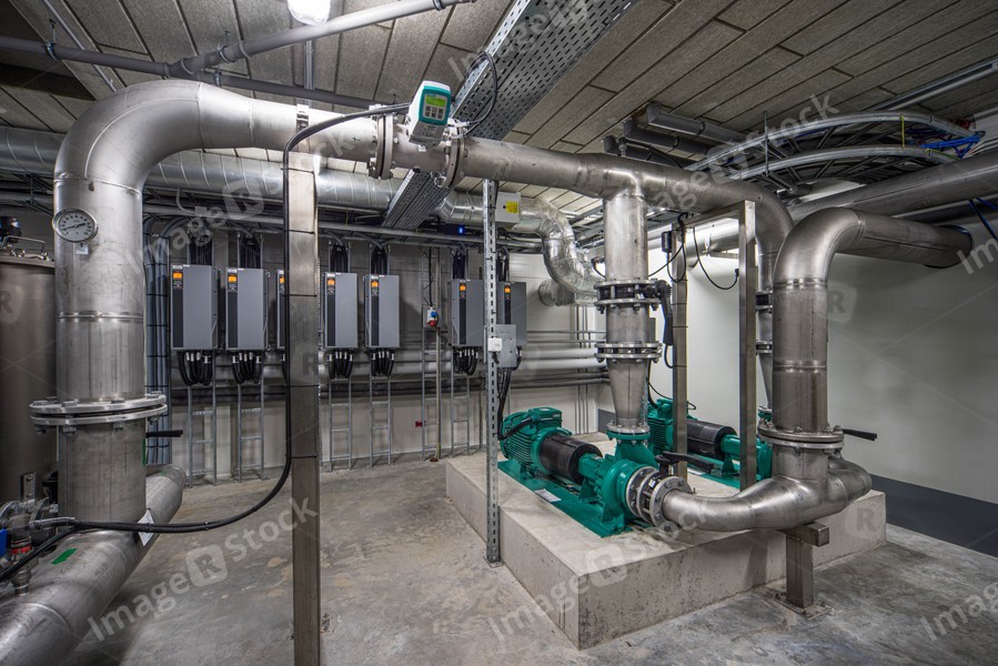Interior of industrial water treatment and boiler room. Single-stage, low-pressure centrifugal pump. Heating system.