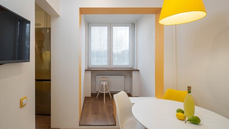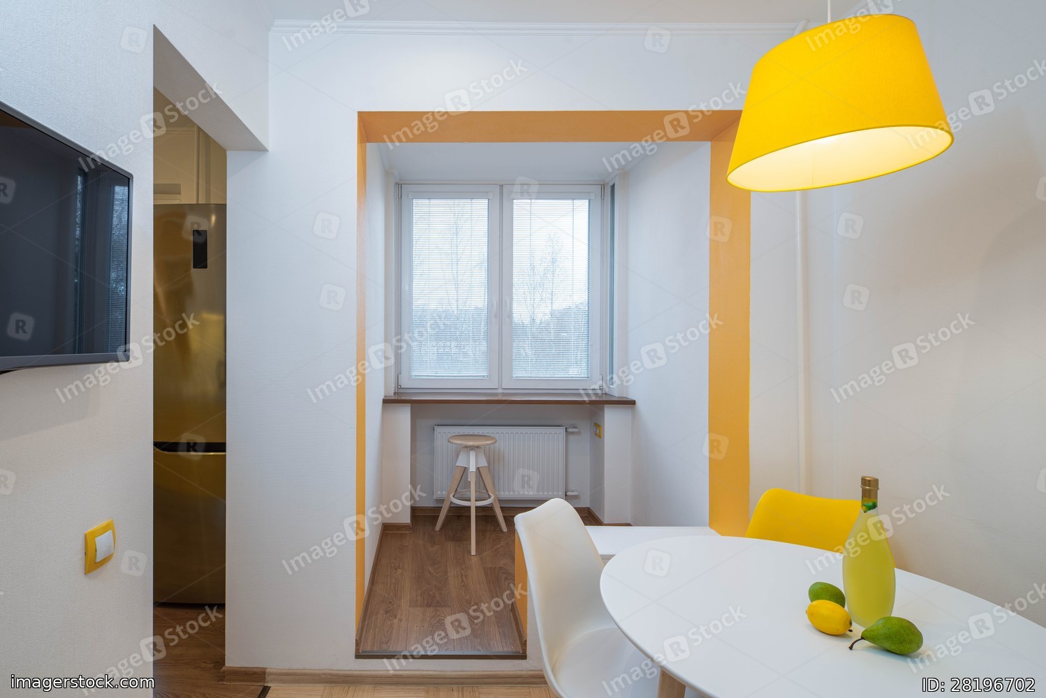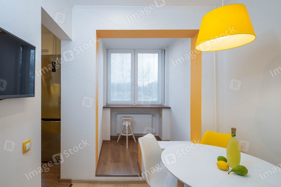 Contemporary interior of modern flat. Kitchen and small room. Liquor, lemon and pears on white table.