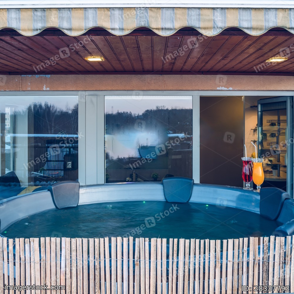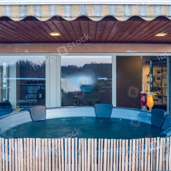 Open terrace with hot outdoor wooden bath tub. Luxury private house.