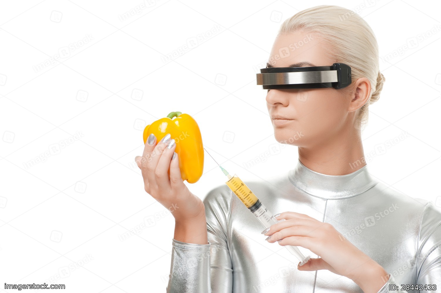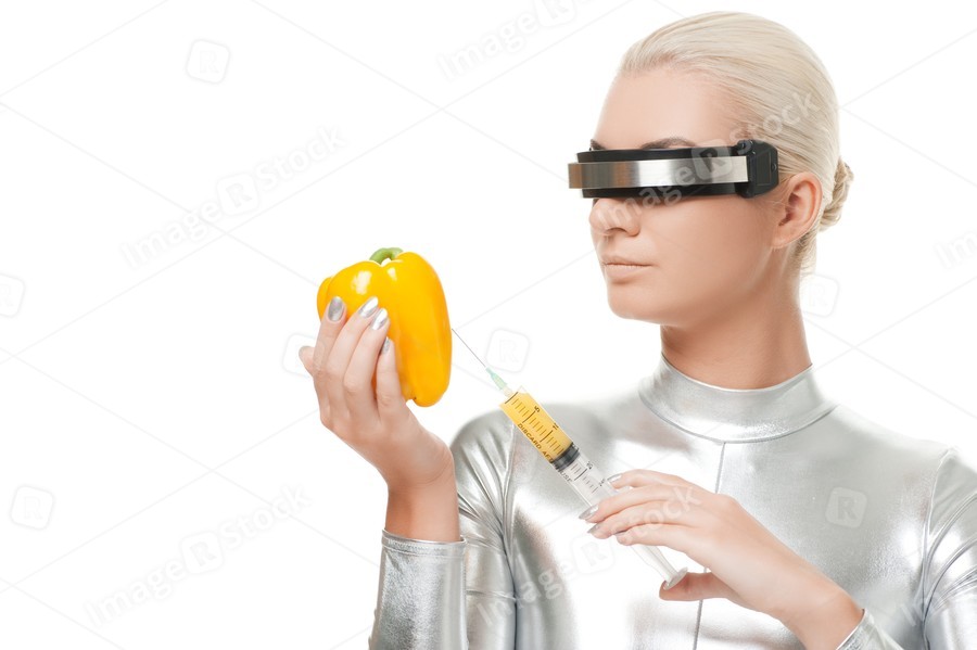 Cyber woman taking vitamins from sweet pepper