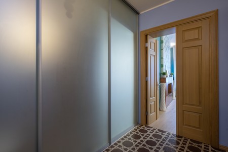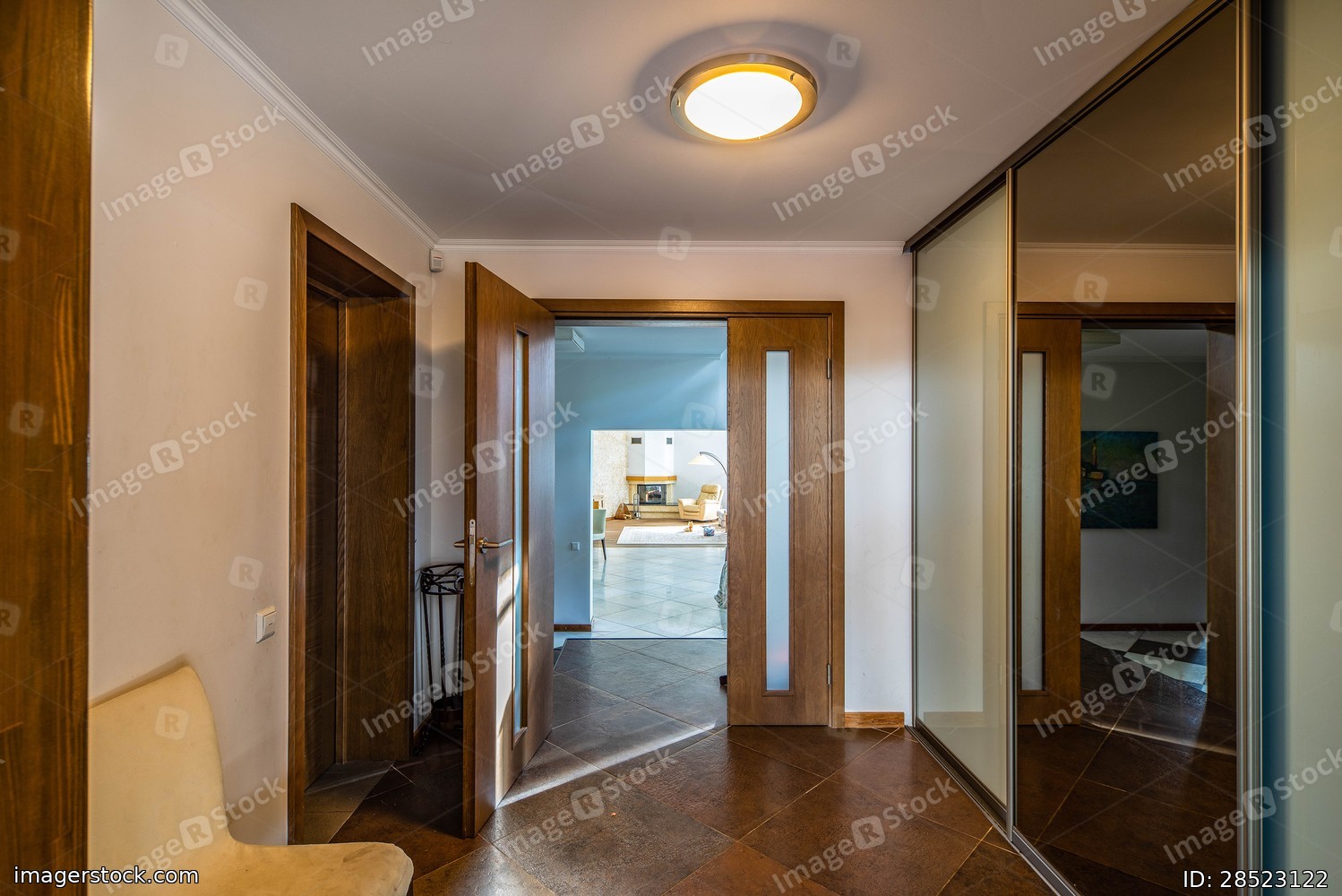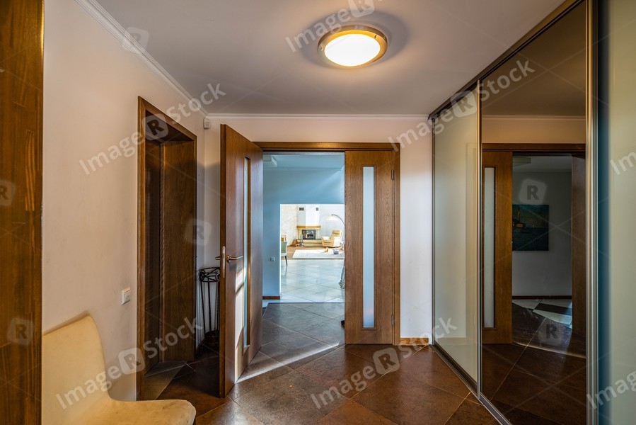 Modern interior in brown colors of entrance hall. Tiled floor. Sliding door wardrobe with mirror. Opened door to apartment.