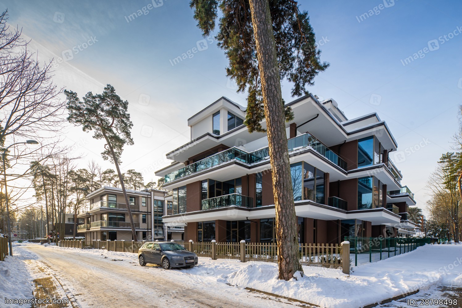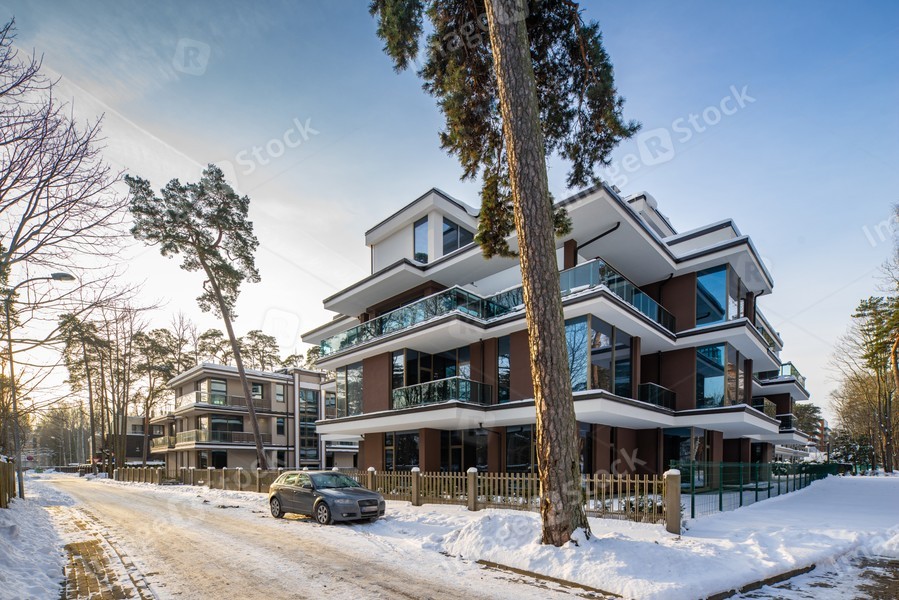 Modern exterior of new luxury residential building at winter.