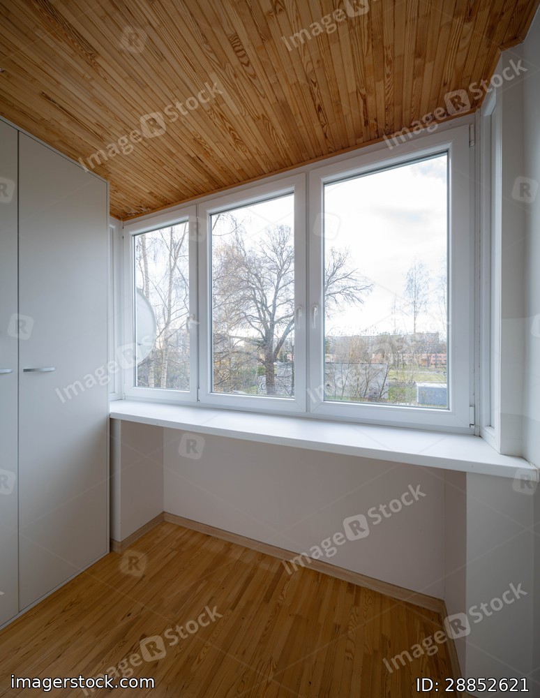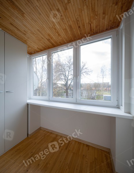 Modern interior of empty dressing room in private house. Wooden floor and ceiling. View of window.