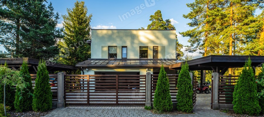 Exterior of luxury private house at sunny summer day. Green pines. Thujas at modern fence.
