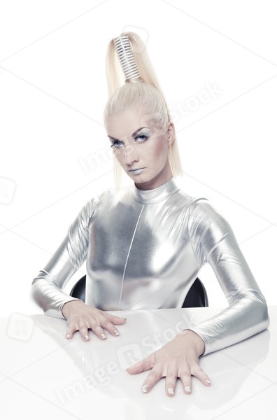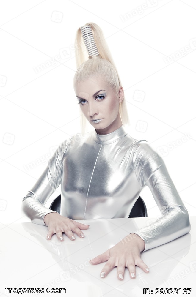 Beautiful cyber woman in silver suit.