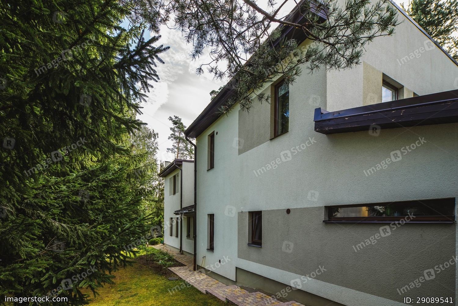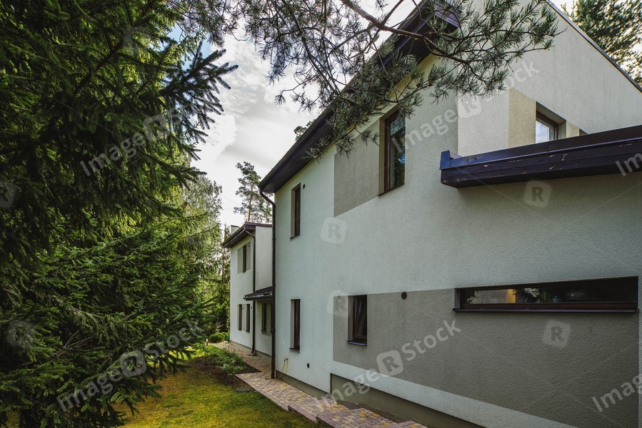 Private house near trees. Modern light exterior. Wall with windows. Summer cloudy day.