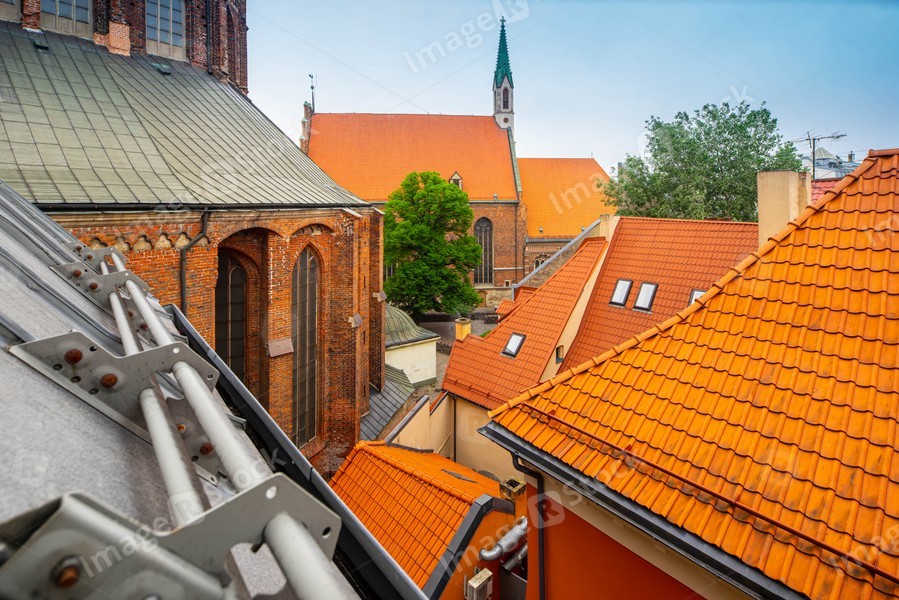 Traditional architecture of Old town of Riga, Latvia. Close-up of red tile roofs. Riga Cathedral. Tourism in Europe.