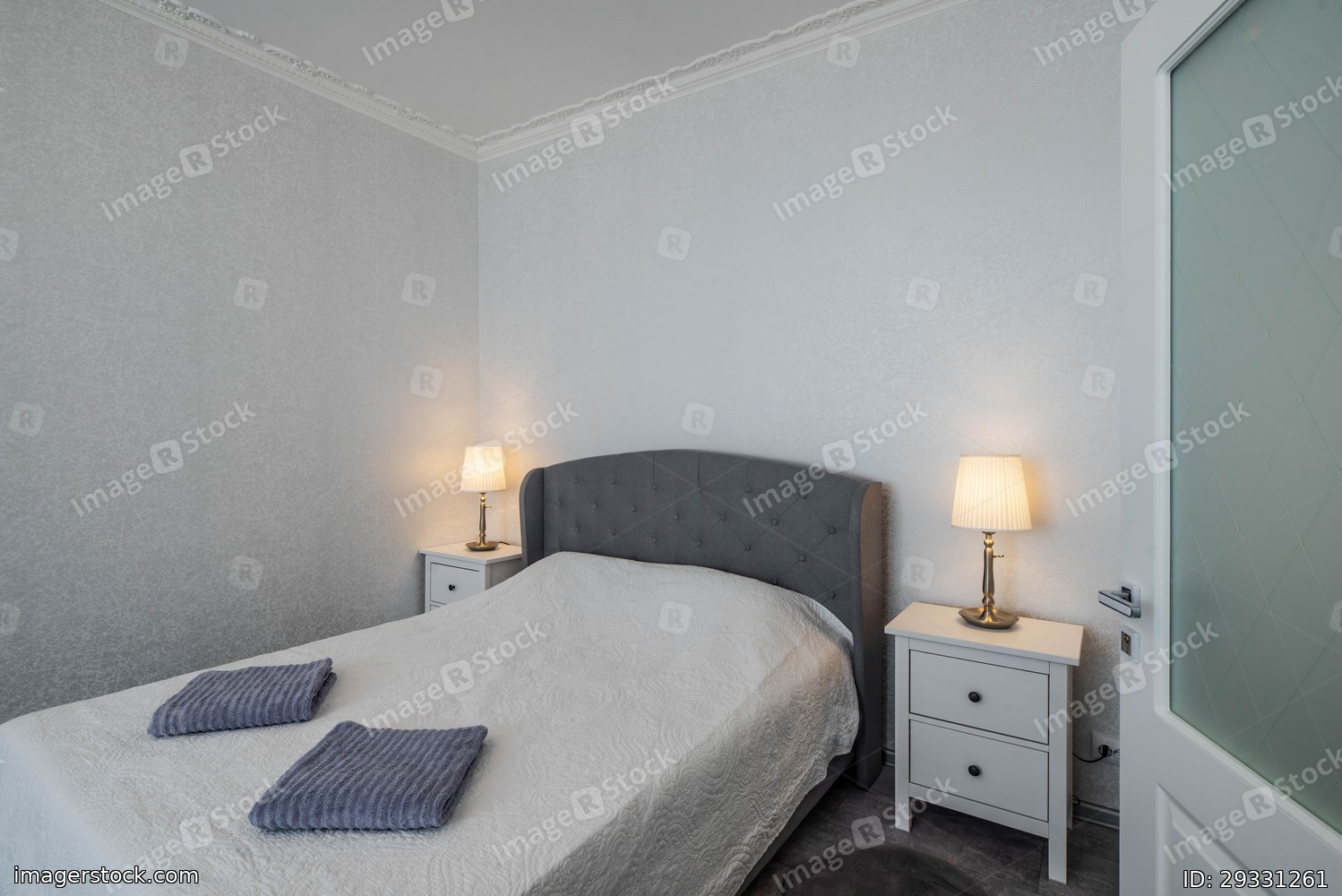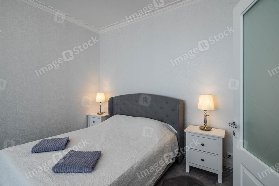 Minimalistic interior of bedroom with king-size bed and bedsides.