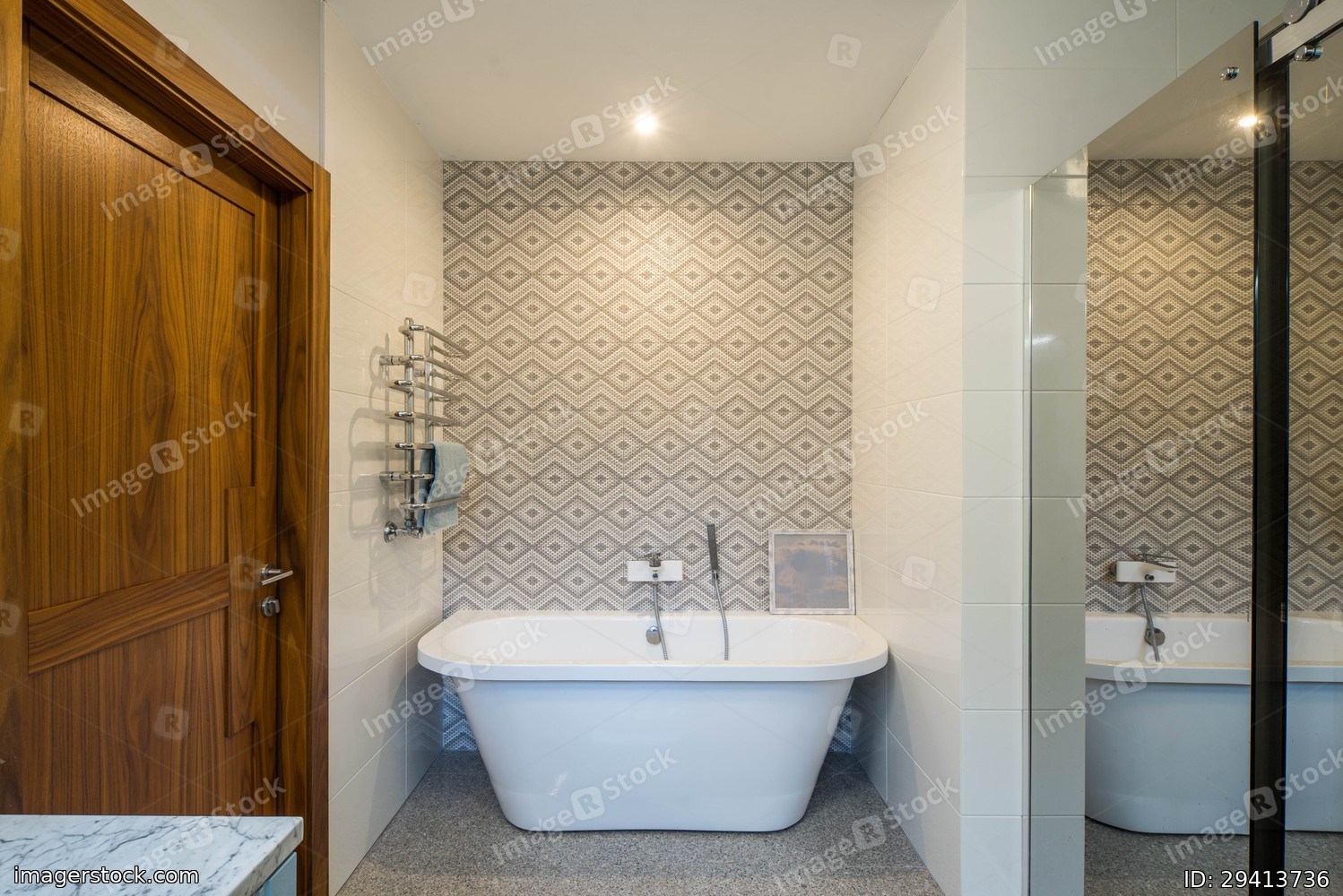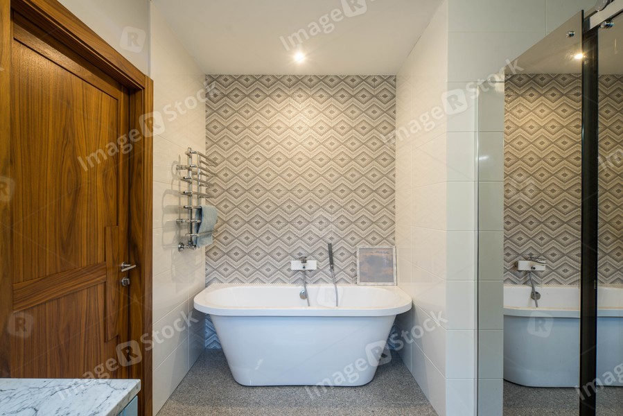 Modern light interior of bathroom. Wooden door. White bath. Big window.