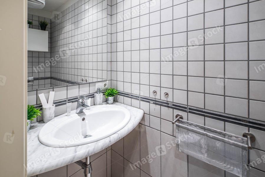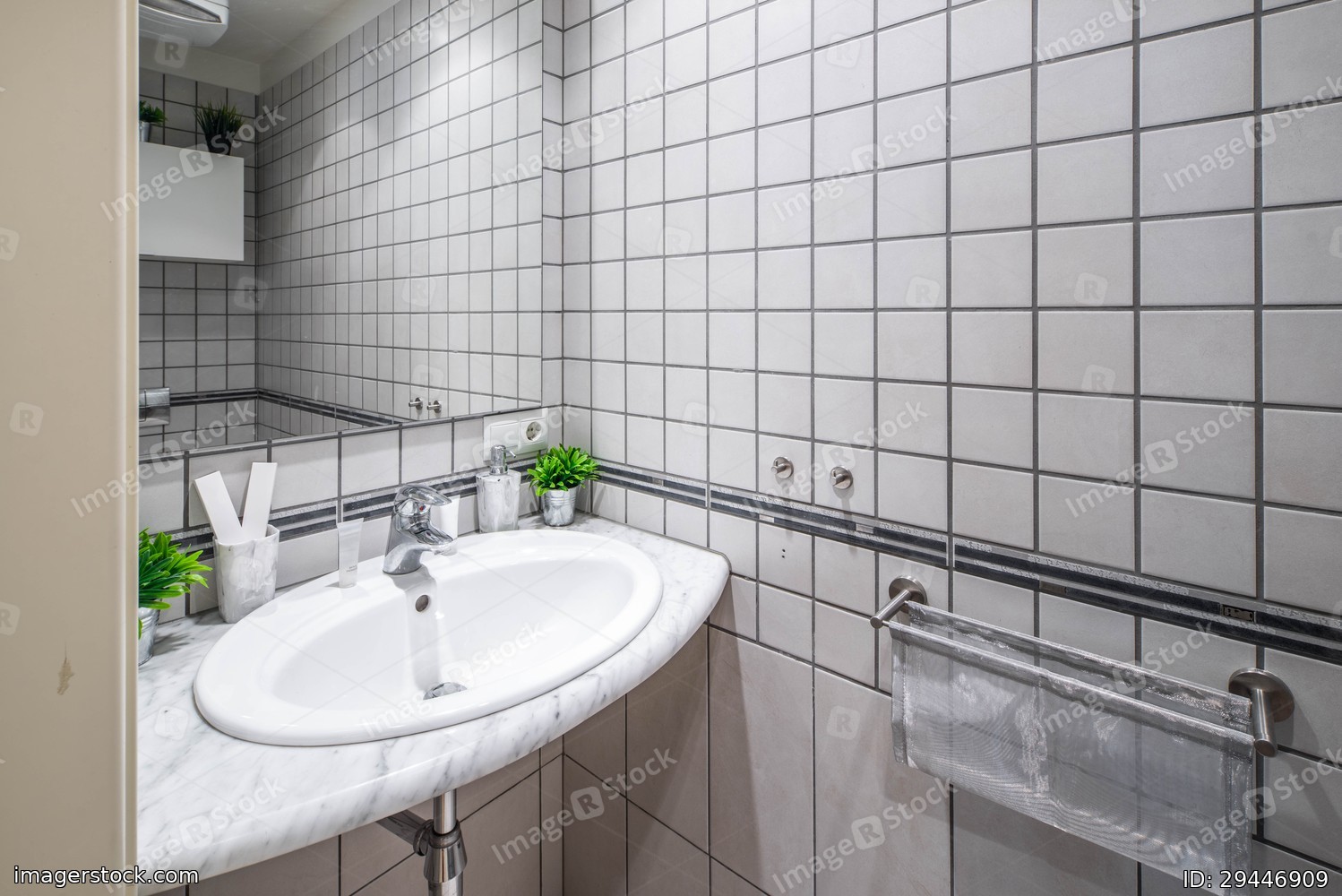 Interior of bathroom with grey tile on the walls. Sink with mirror. Green flowers.