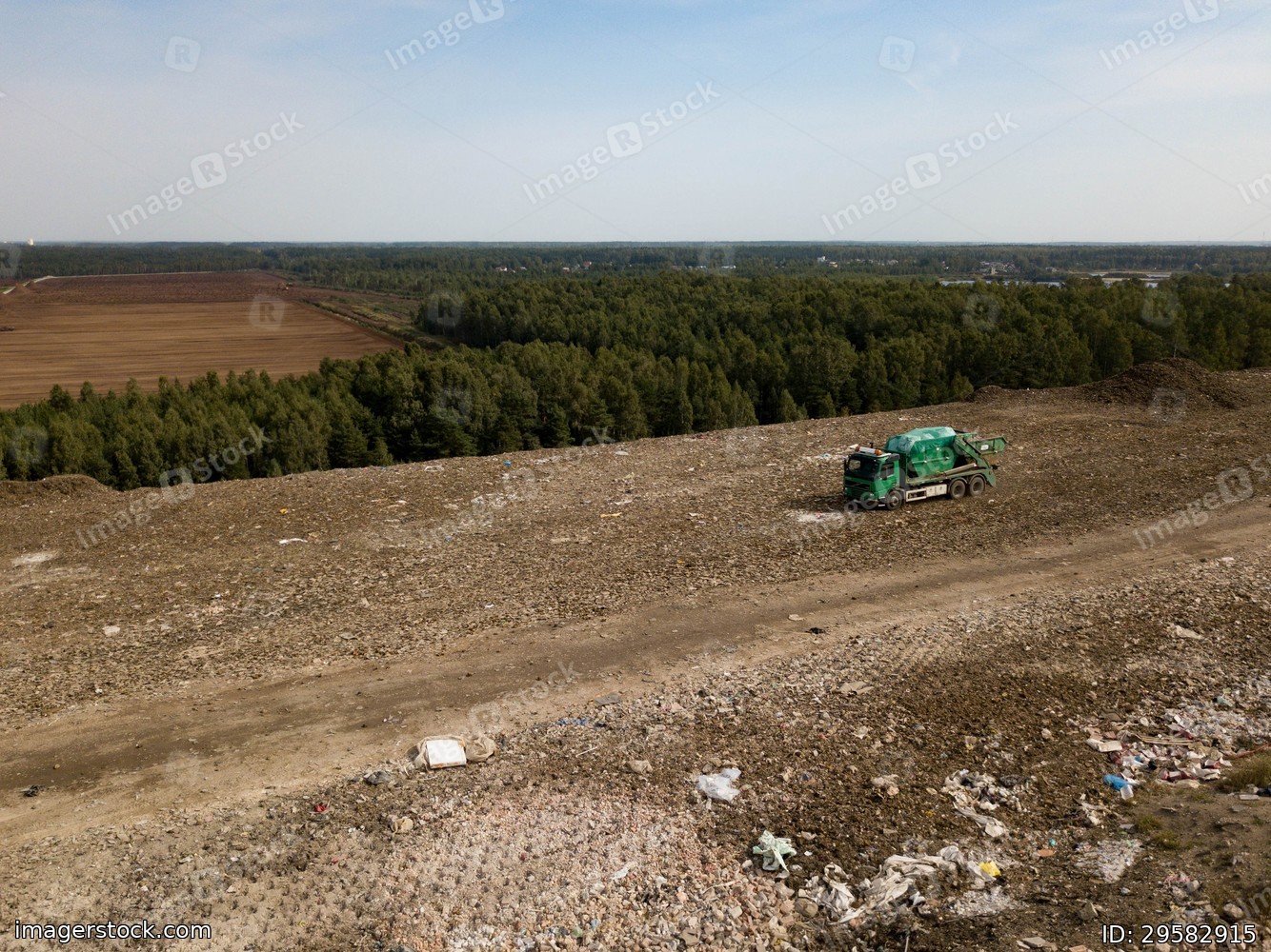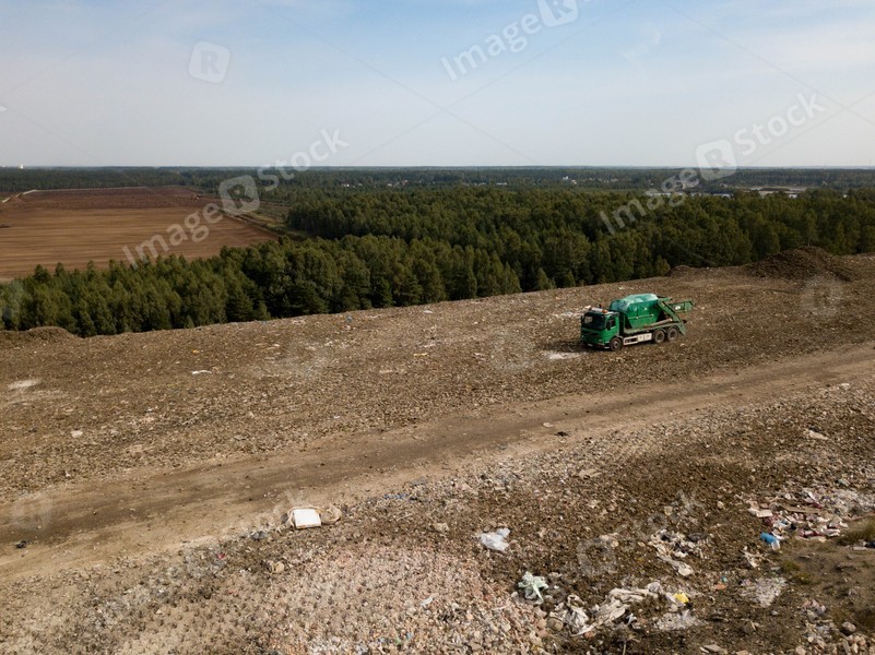 Aerial view from above of green garbage truck on dirt road near dump. Green forest.