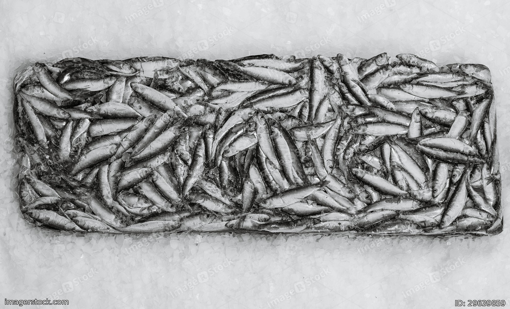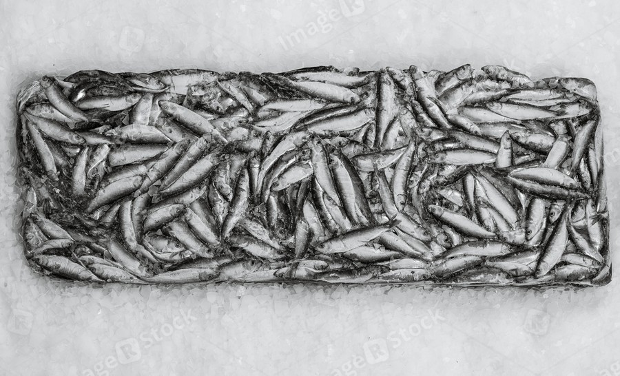 Close-up of sprat brick on the ice in fish market. Winter fishing. Frozen small silver fish. Pieces of ice.