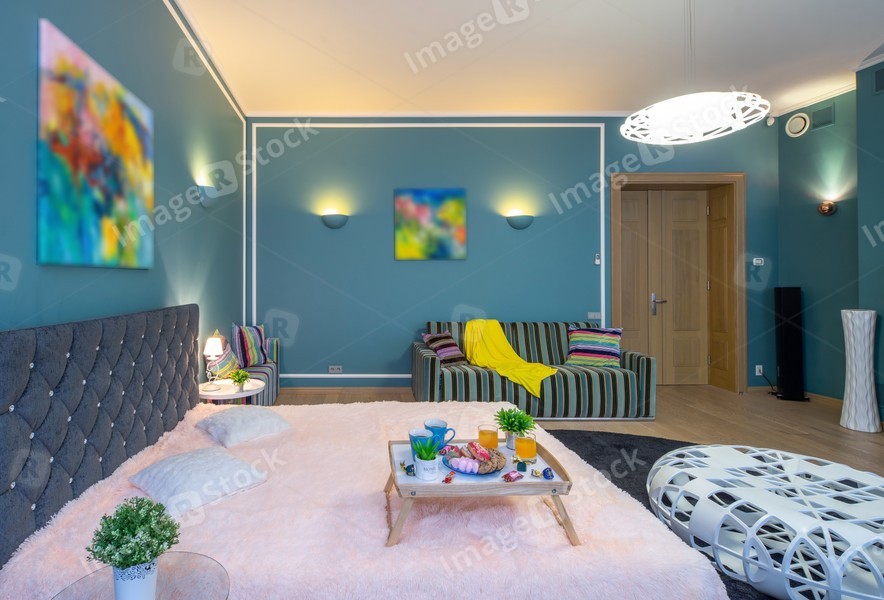 Modern interior of spacious studio apartment. Living room. King-size bed.