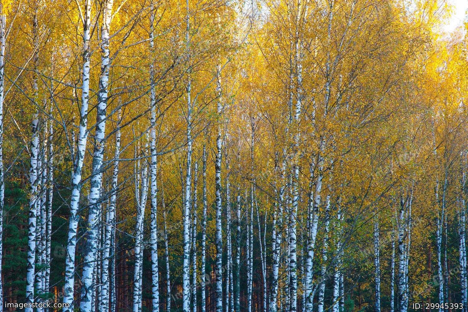 Birches view from below upwards, autumn, yellow leaves.