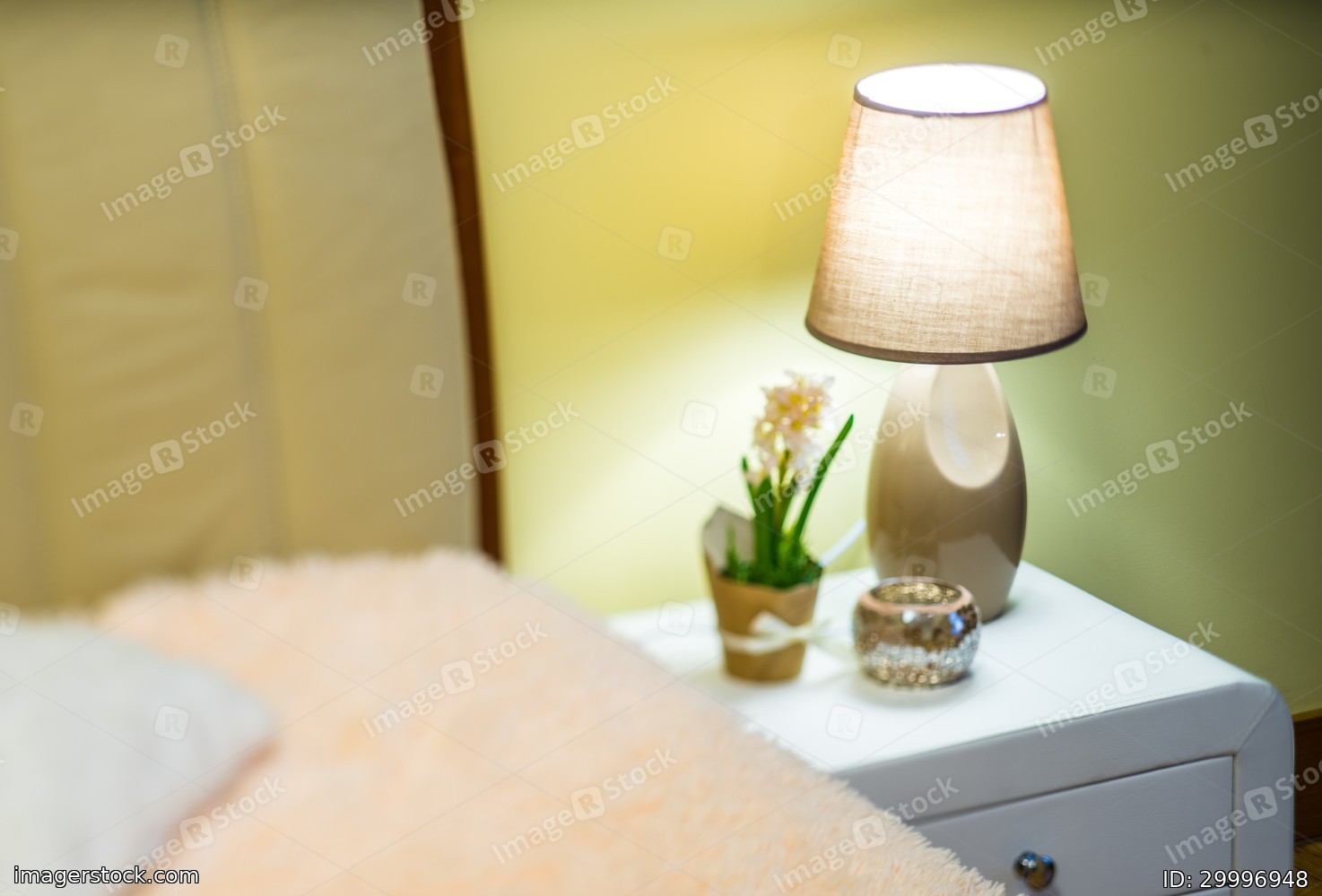 Close-up of lamp and flower on the white bedside.