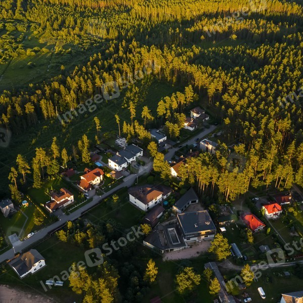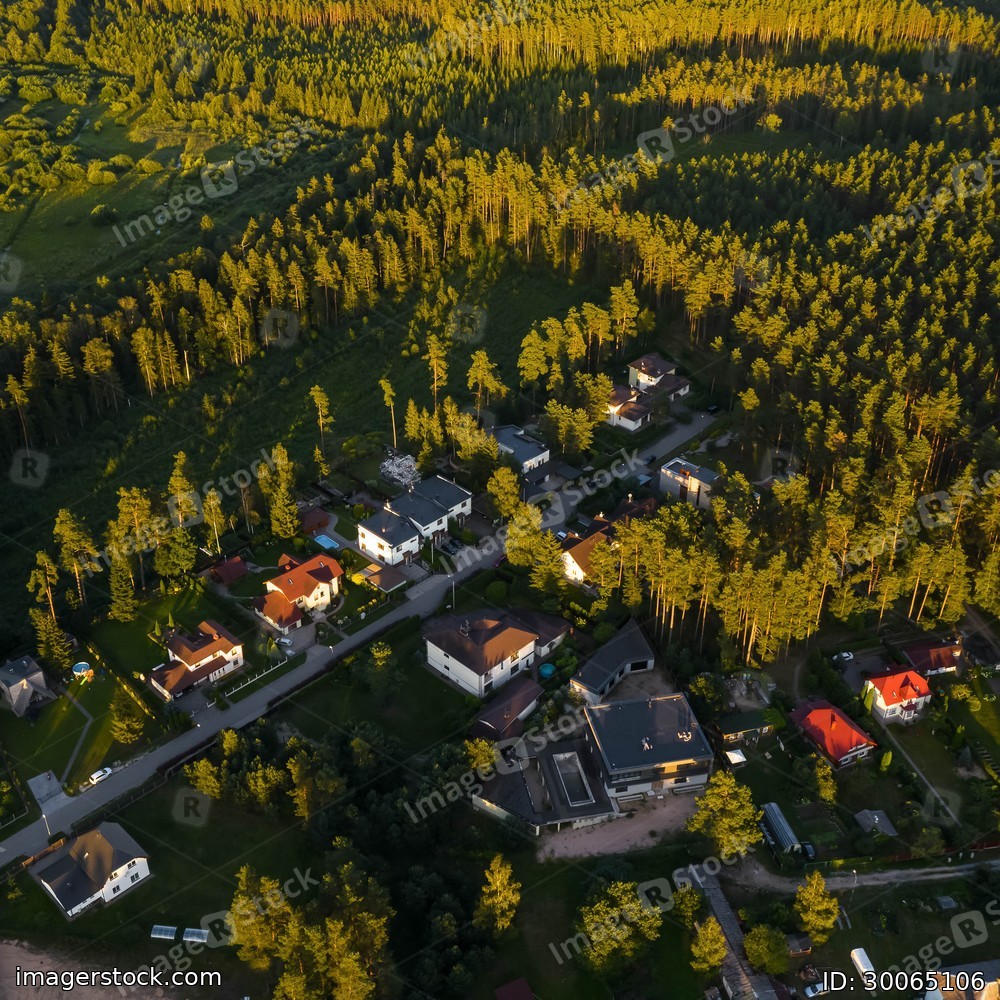 Top drone view of of private sector of city. Modern architecture. Green grass and trees. Road with cars. Town near forest.