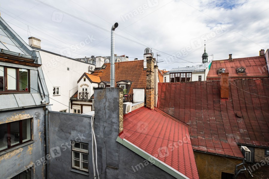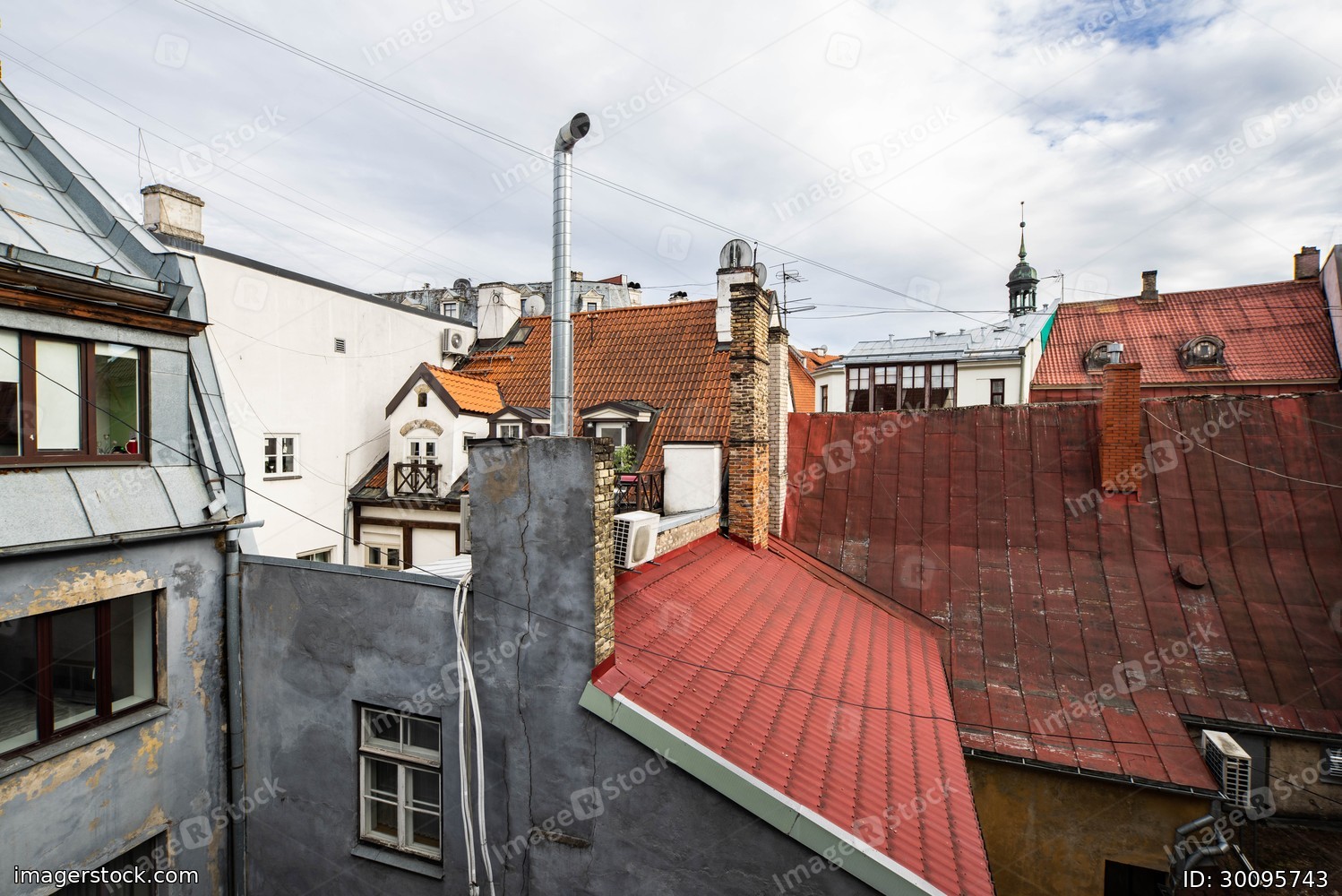 Architecture Of Riga, Latvia. Red roof. Cloudy weather.