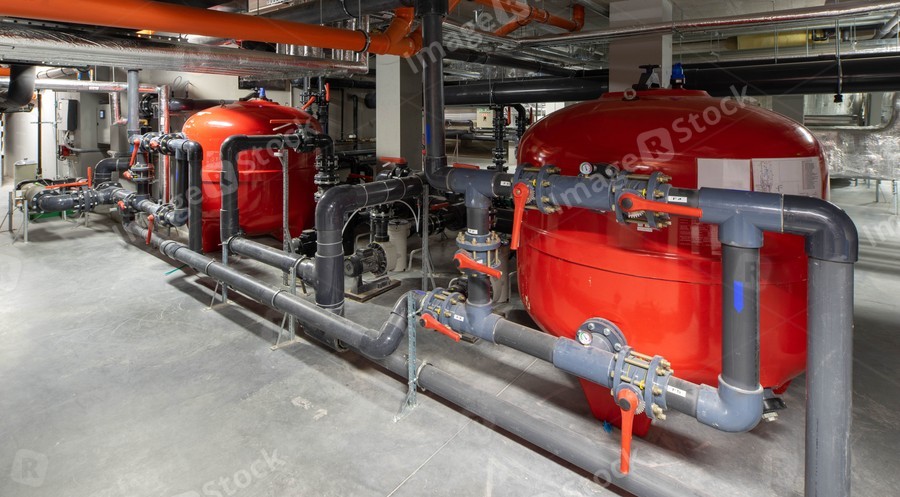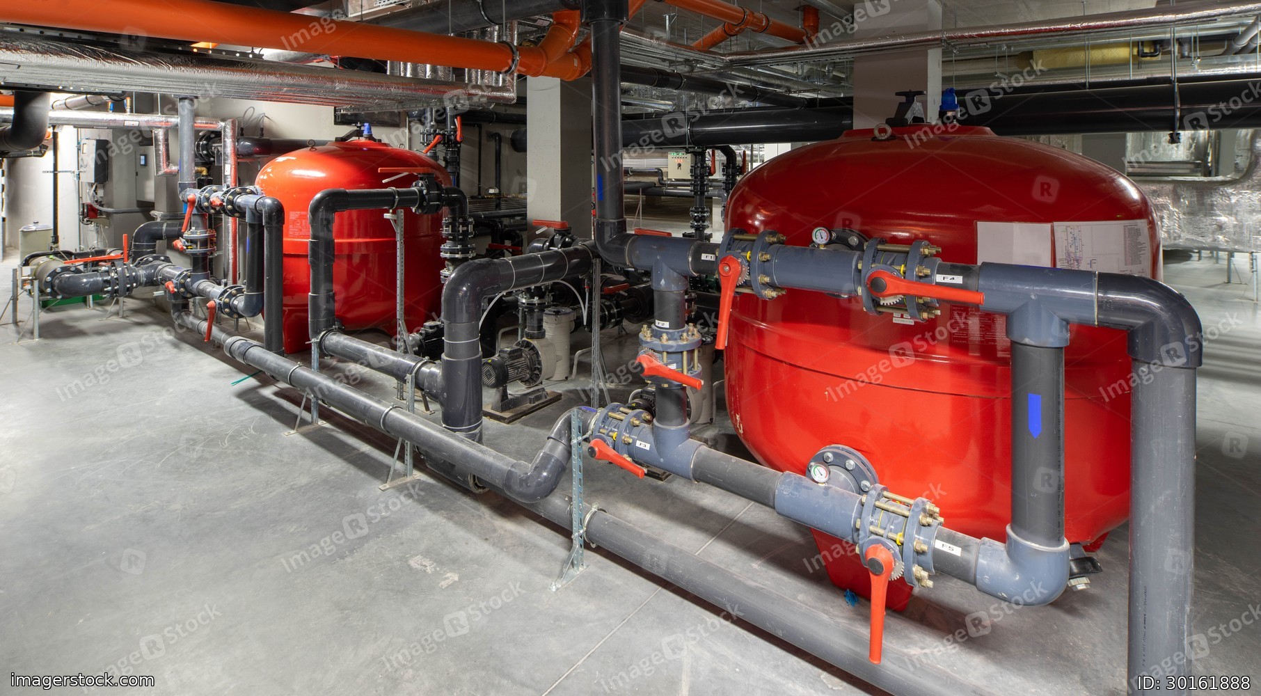 Boiler room. Heating system. Large boiler units. Metal piping system.