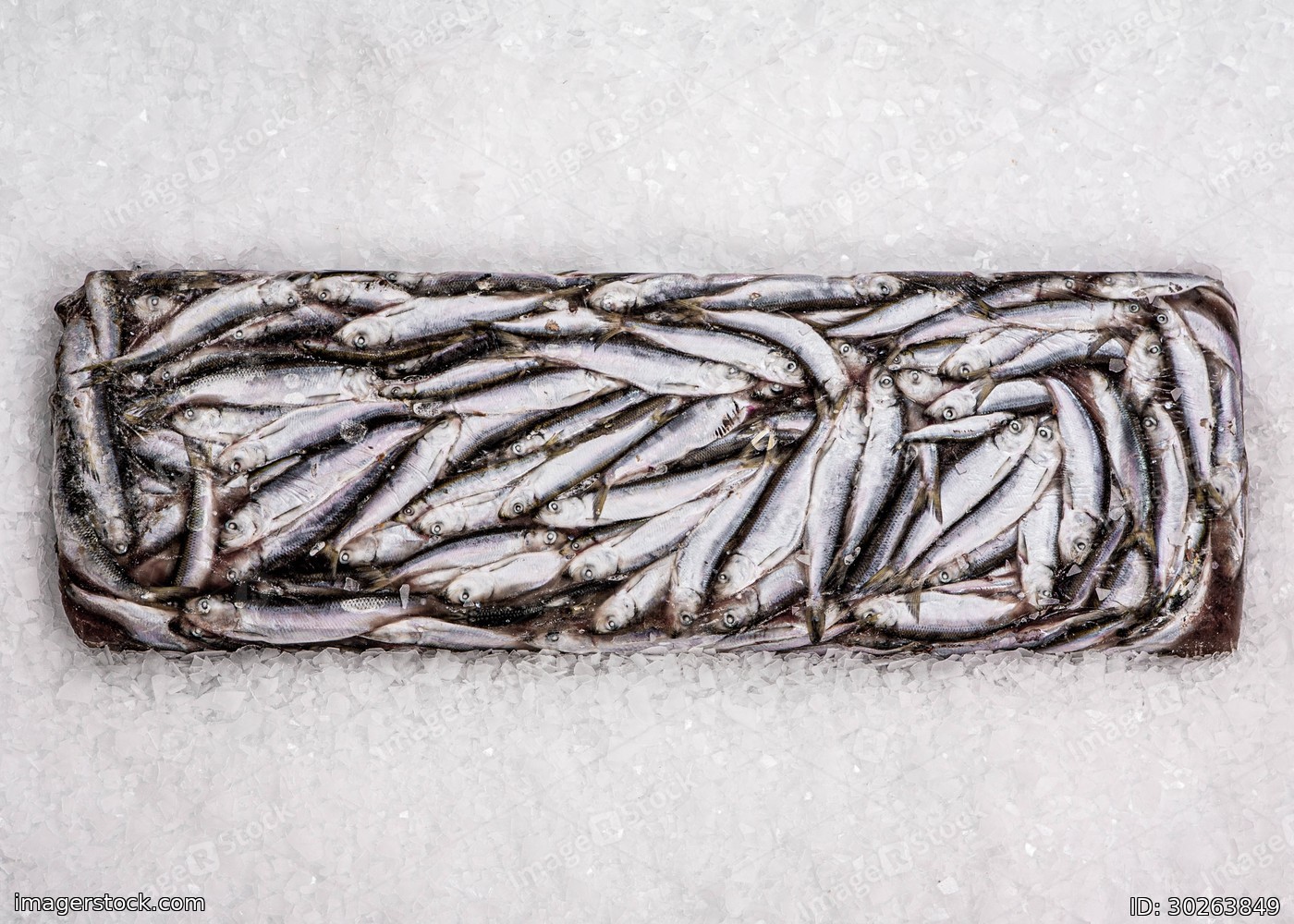 Close-up of frozen sprat brick on the ice in fish market. Winter fishing. Small silver fish.