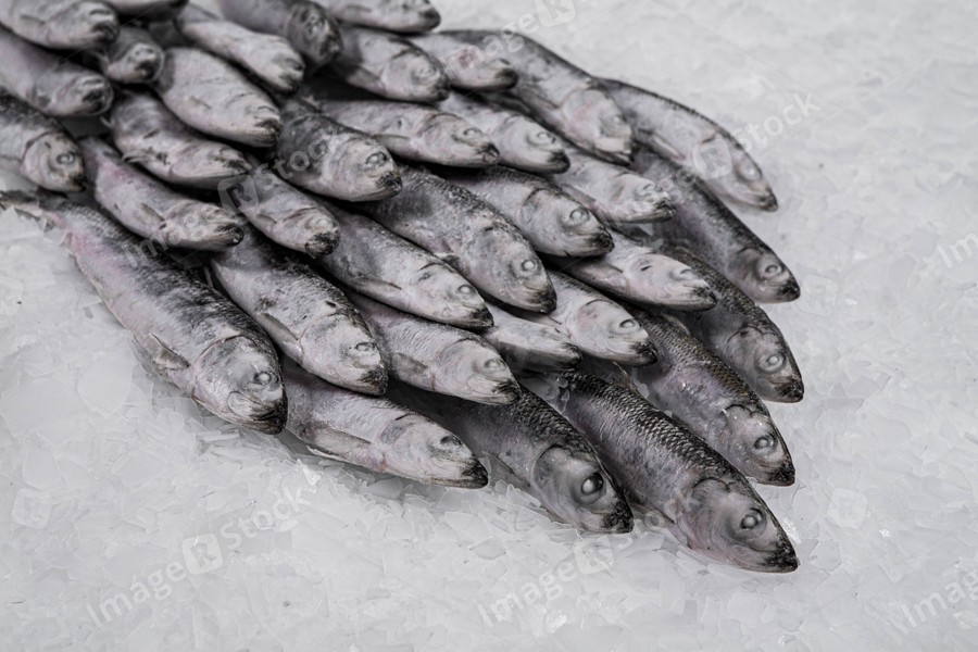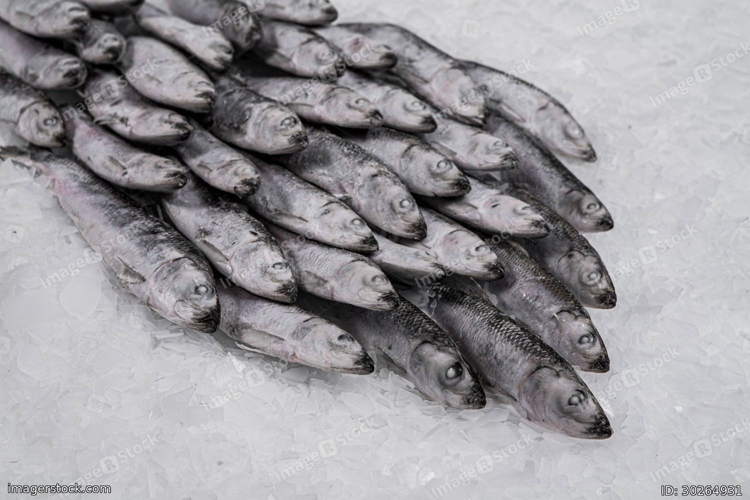 Close-up of fresh sprat on the ice in fish market. Winter fishing. Small silver fish.