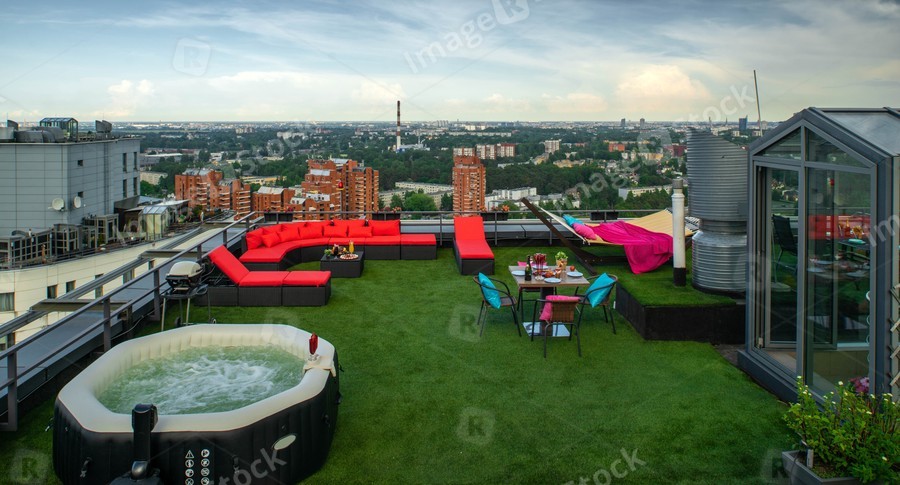 Relaxing zone on the rooftop with furniture and hot tub. Veiw of city from the top.