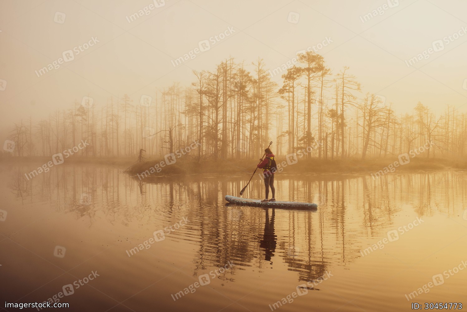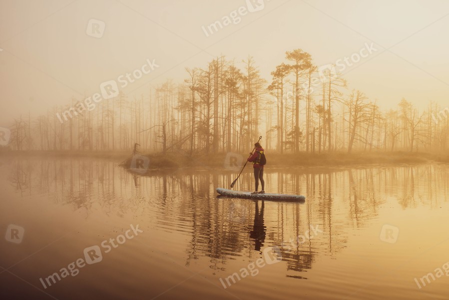 Woman slowly floating on the water on the sup-board. Fog and swamp.