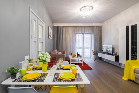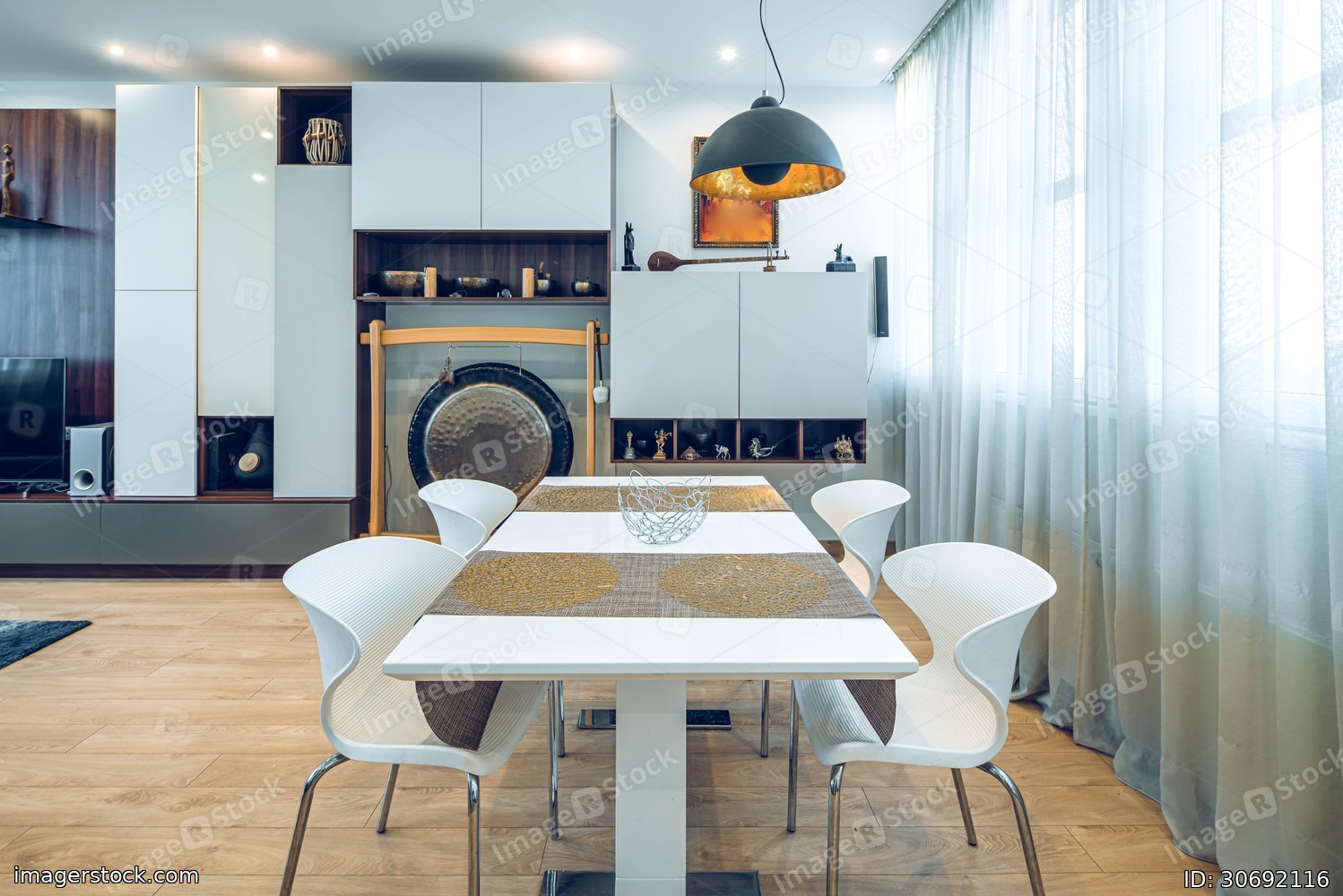 Modern interior of living room in luxury apartment. Table and chairs. Home decor. Tibetan bowls and decorative gong. White wall unit.