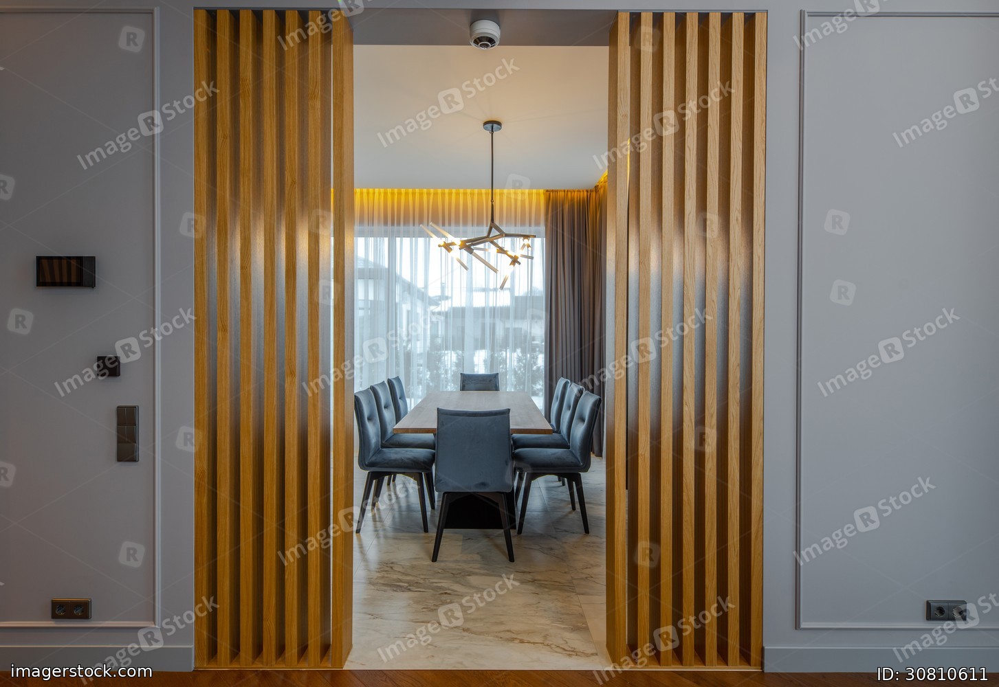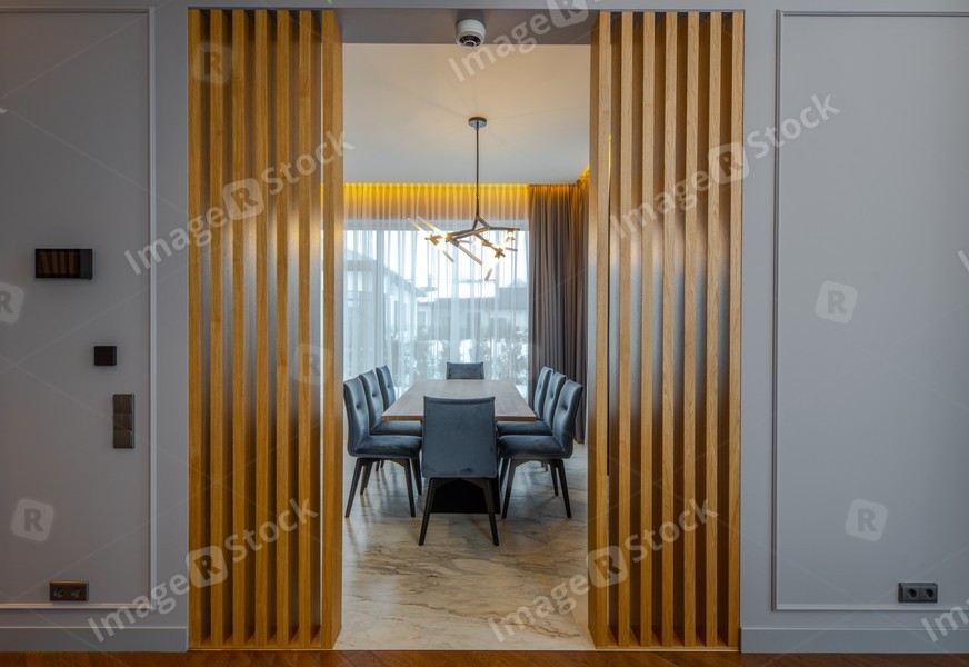 Huge table and chairs in kitchen. Luxury interiro with wooden design.