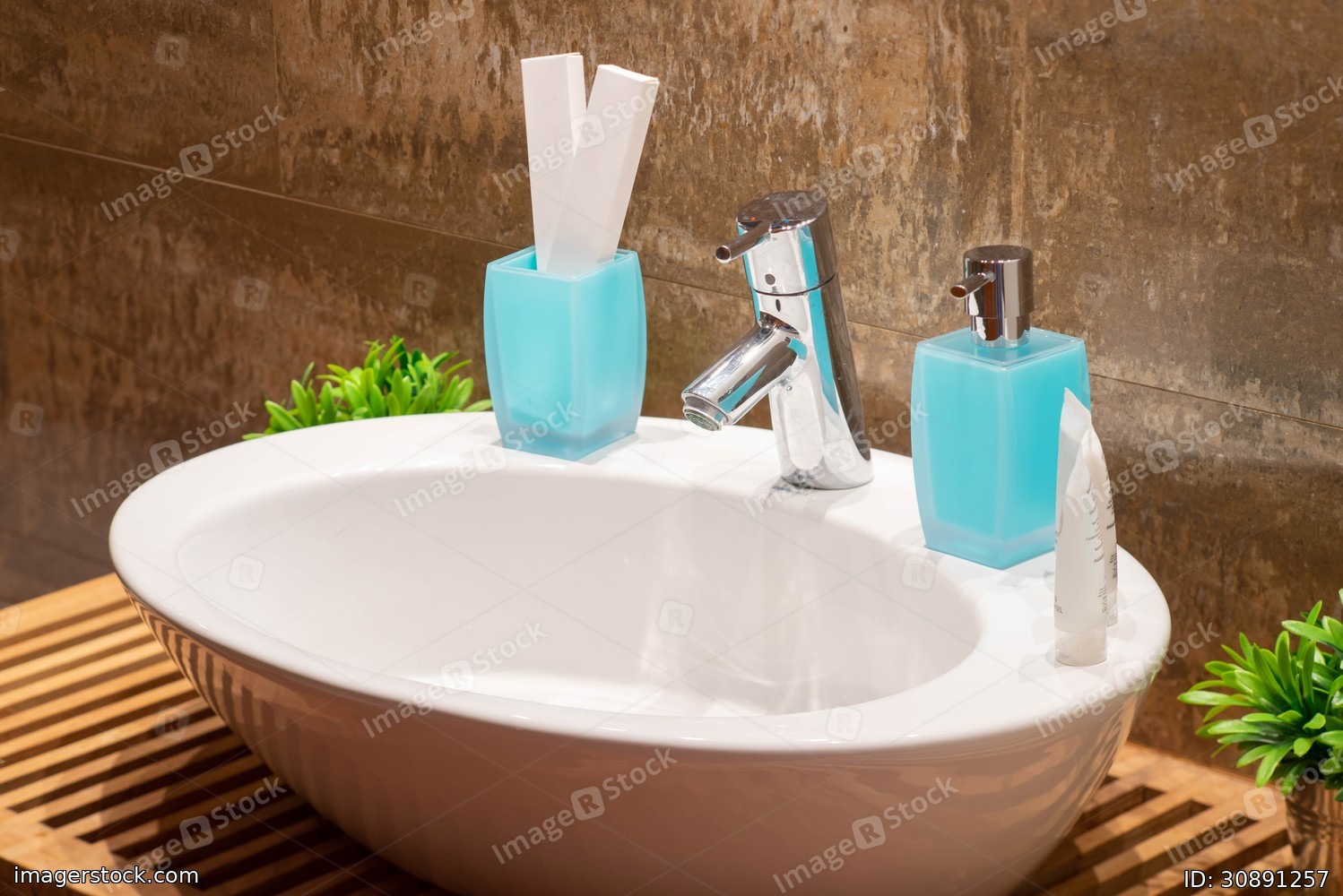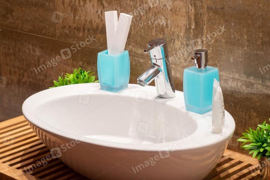 Sink in bathroom. Liquid soap. Decorative flowers.