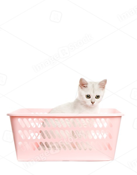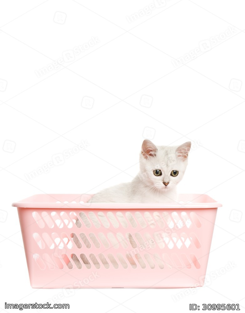 Adorable british kitten sitting in a pink basket. Isolated on white background