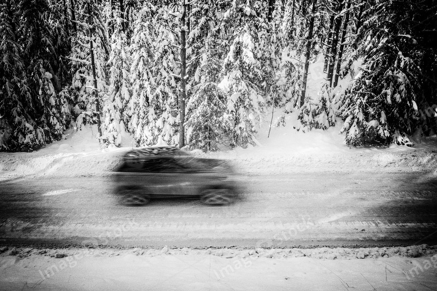 Scenic landscape of winter forest. Car on road. Black and white.