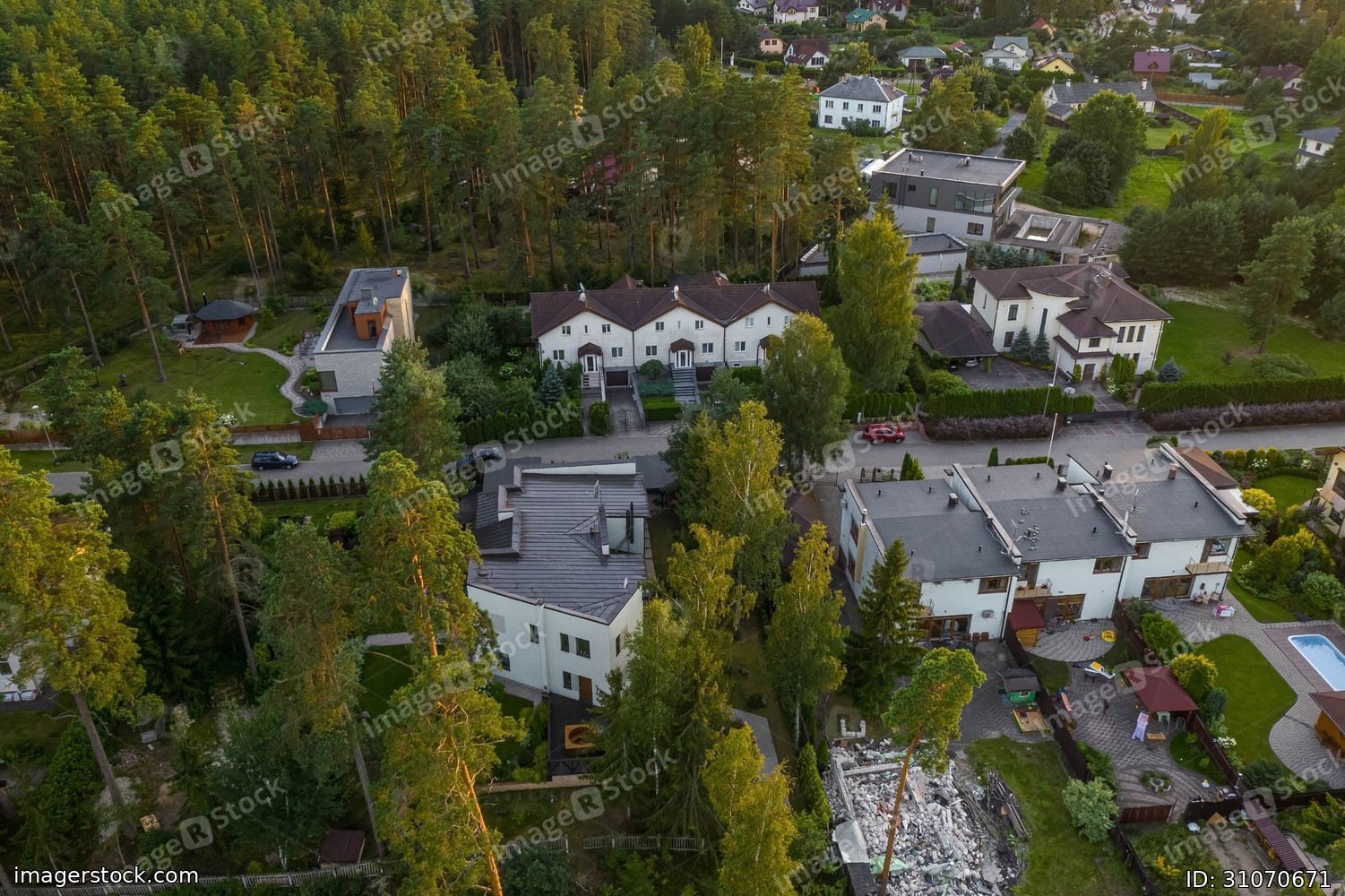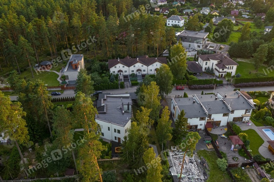 Aerial view of private sector in european city. Luxury architecture. Modern houses. Green trees.