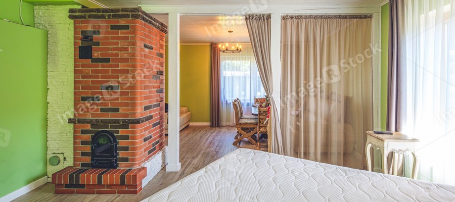Modern interior of luxury bedroom in private house. Huge bed. Brick fireplace. Set table. Green walls.