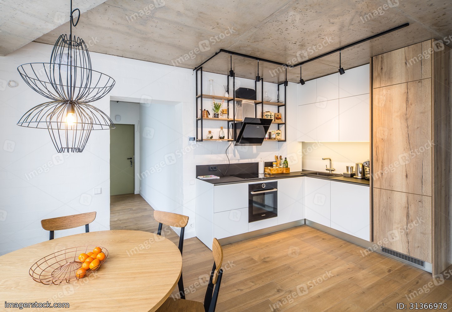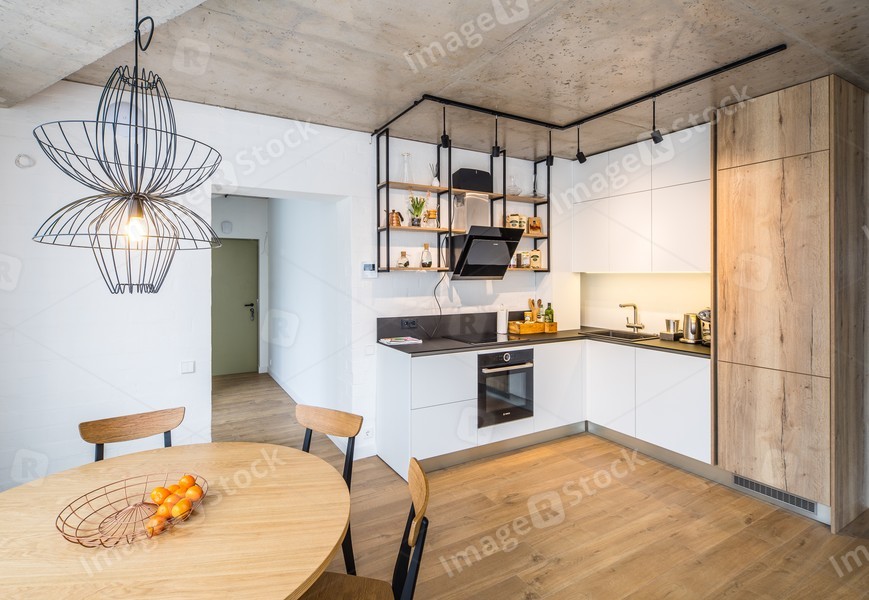 Interior living room bathroom with a sofa in the studio apartment. Concrete ceiling. Loft.