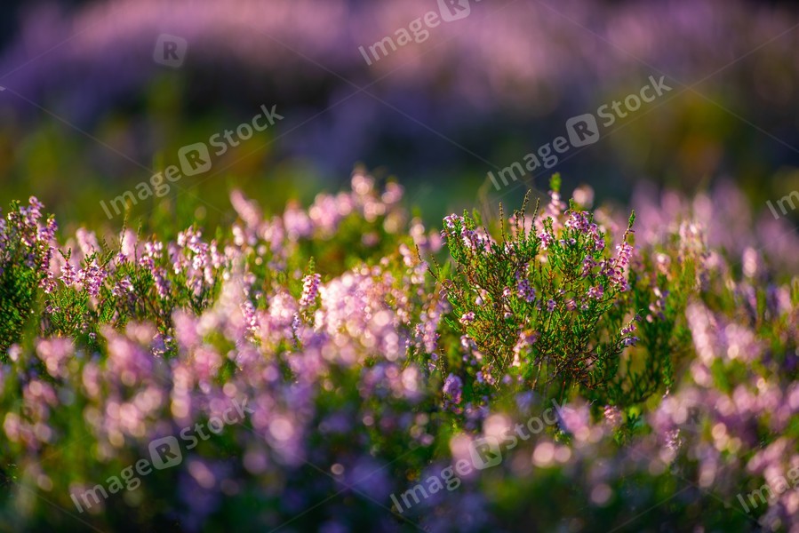 Sunny day. Blooming heather. Beautiful lawn in the forest.