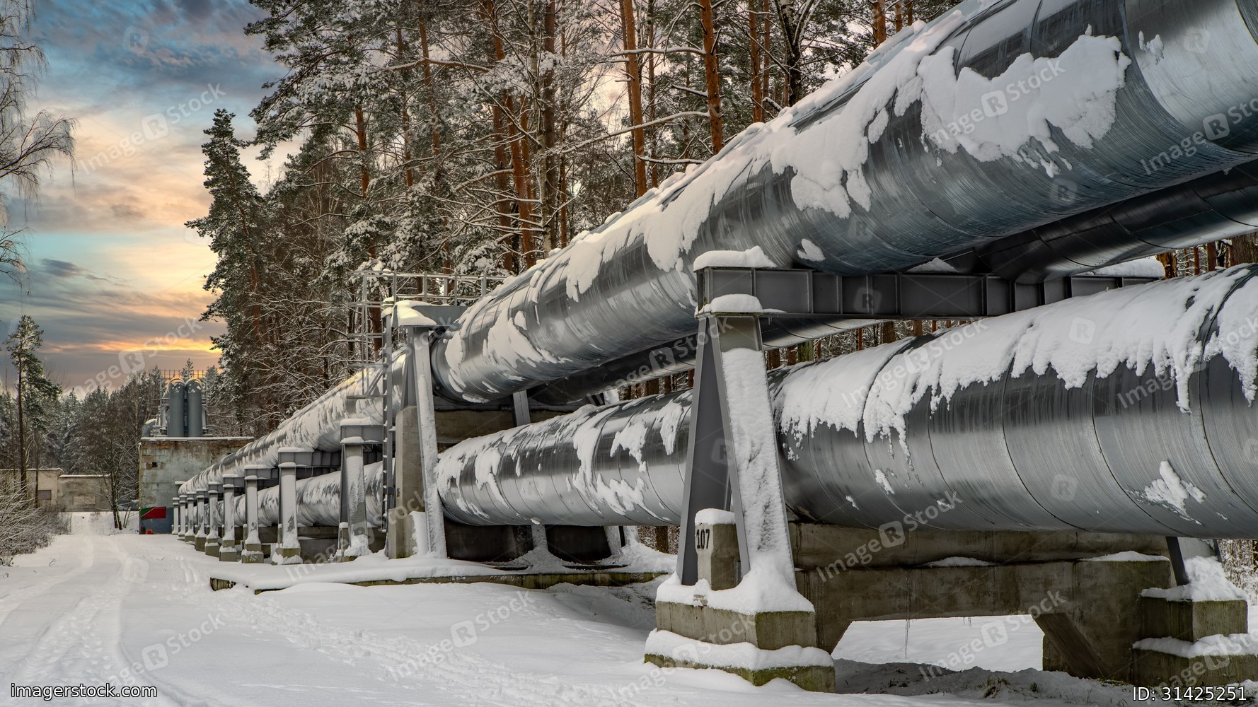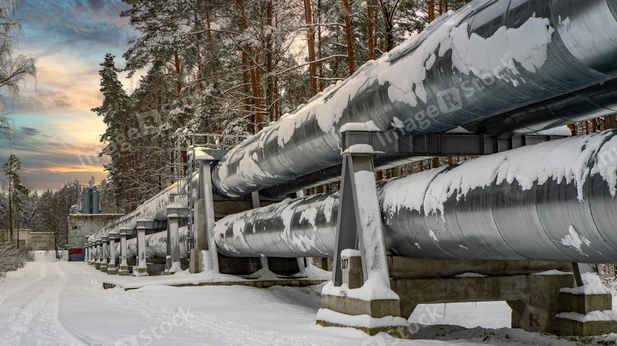 Huge industrial pipelines of central heating system. Snow on pipes.
