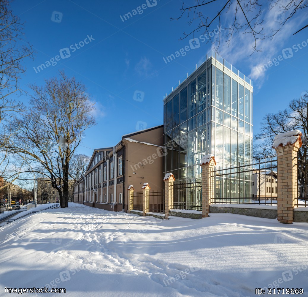 Exterior of modern urban building. Glass walls. Sunny winter day.