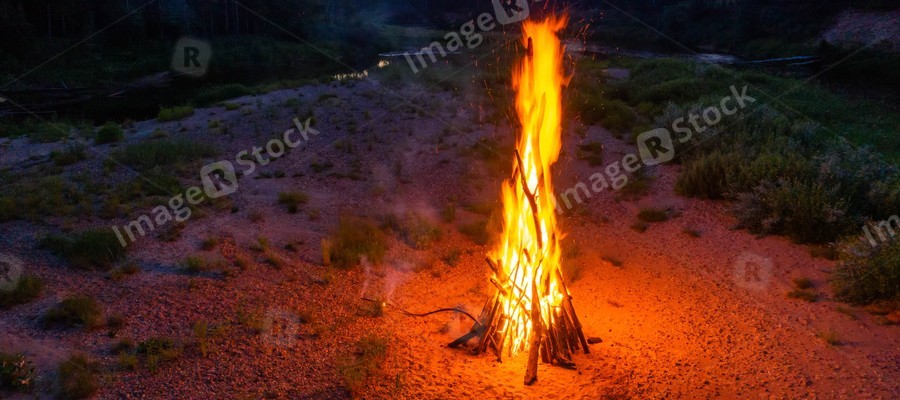 Midsummer Ligo celebration. Huge bonfire on the river shore. Scenic landscape of forest. Sunset sky. Top view.