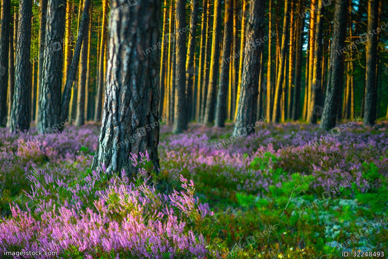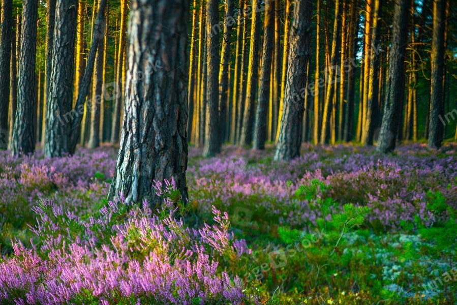 Sunny day. Blooming heather. Beautiful lawn in the forest.